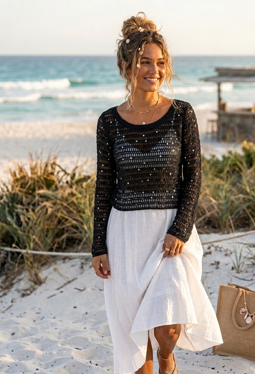 Pailetten Häkel Pullover Netz Pulli Boho Vintage Einzigartiges Bolero Cotton