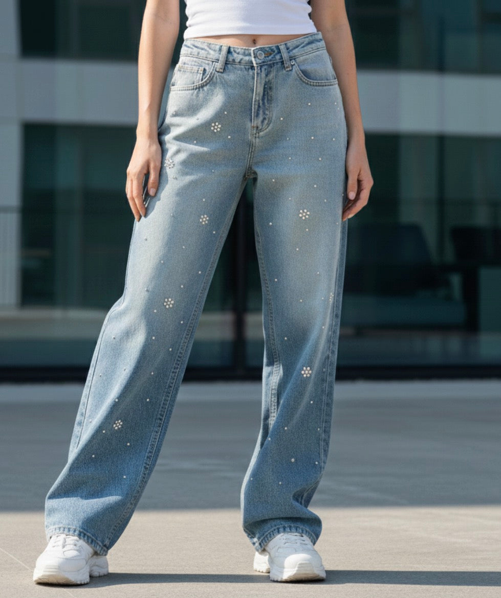 Sexy Woman Jeans Hose Perle Nieten weite Bein sw 1415