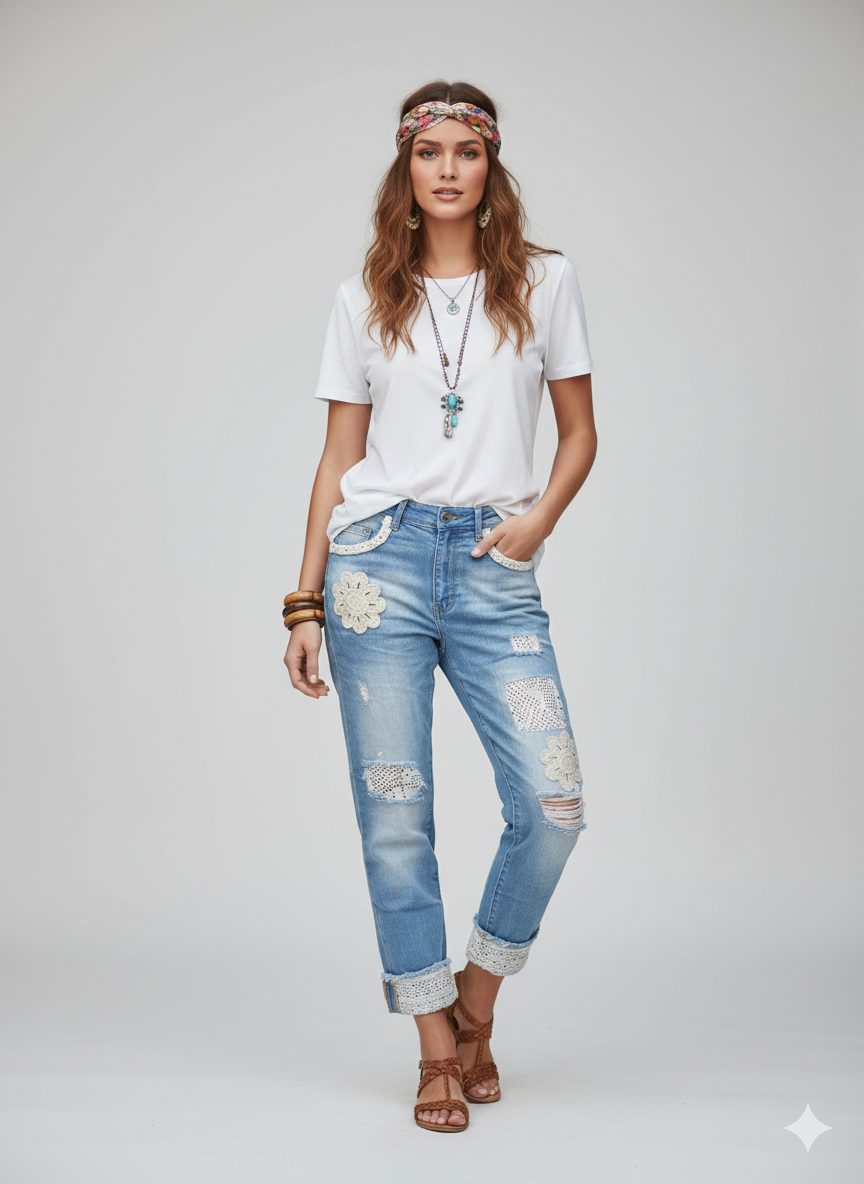 Flower Power: Bestickte Boho Jeans im Vintage-Look