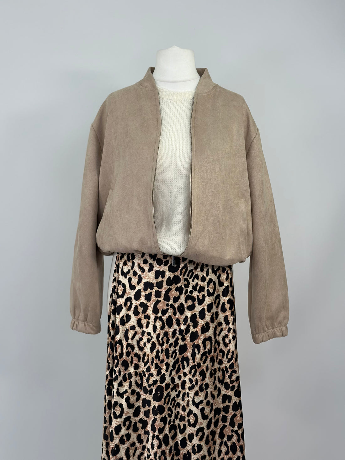 Bomberjacke aus Wildlederimitat in beigefarbener Optik, geeignet für Größe 36/42. Das Material ist pflegeleicht und...