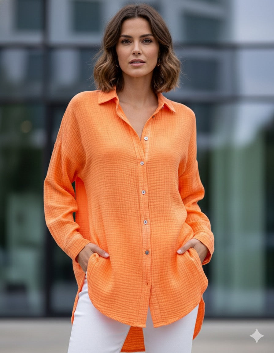 Entdecken Sie unser neues Damen Musselin Hemd Bluse, gefertigt aus 100% gecrinkeltem Baumwollstoff für höchsten...