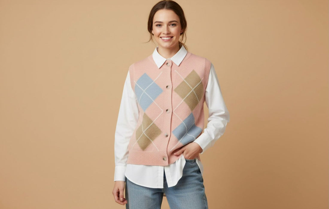 Alpaka-Mix Argyle Strickweste | Ärmellos | 3-Saison Strick-Cardigan | Hochwertiger Damen Pullover