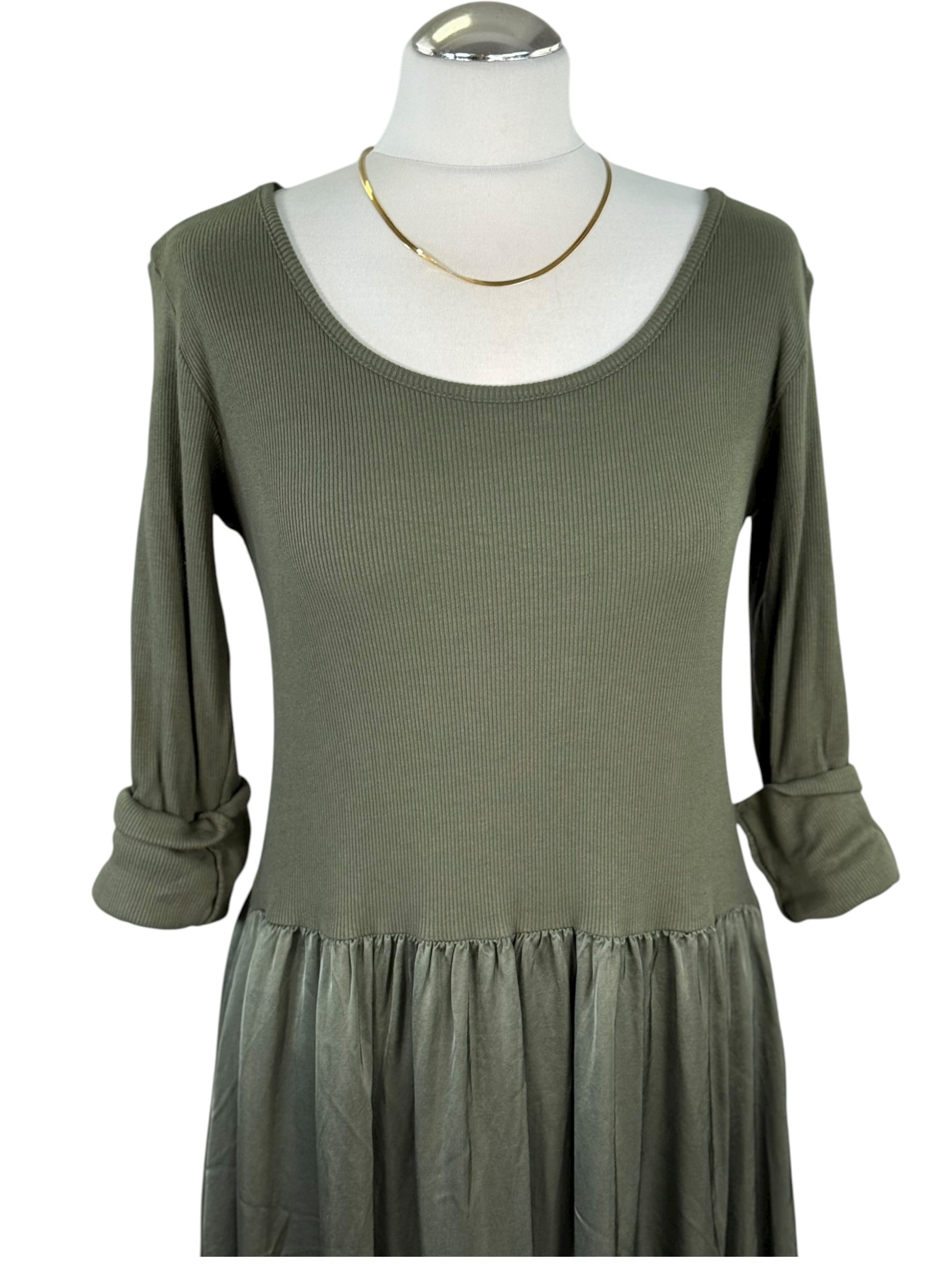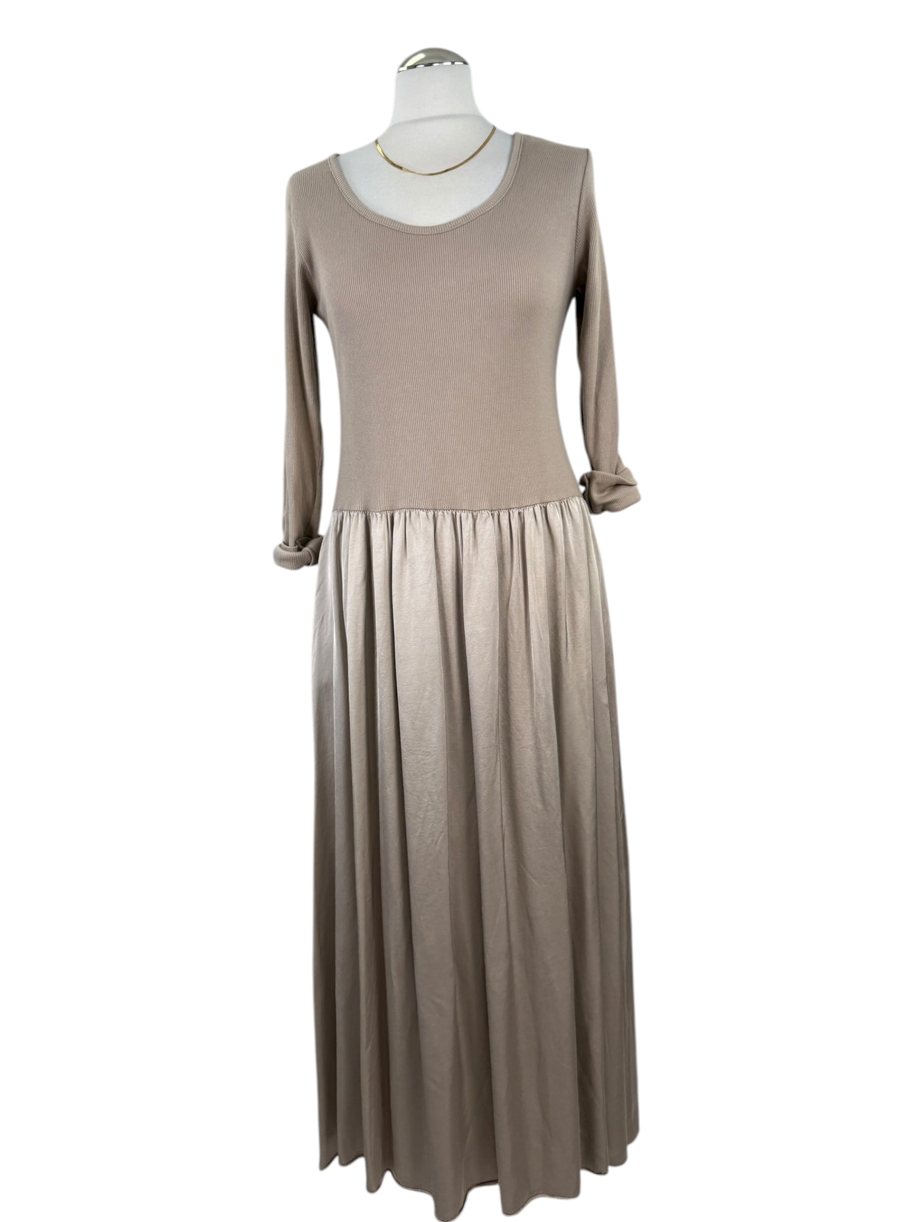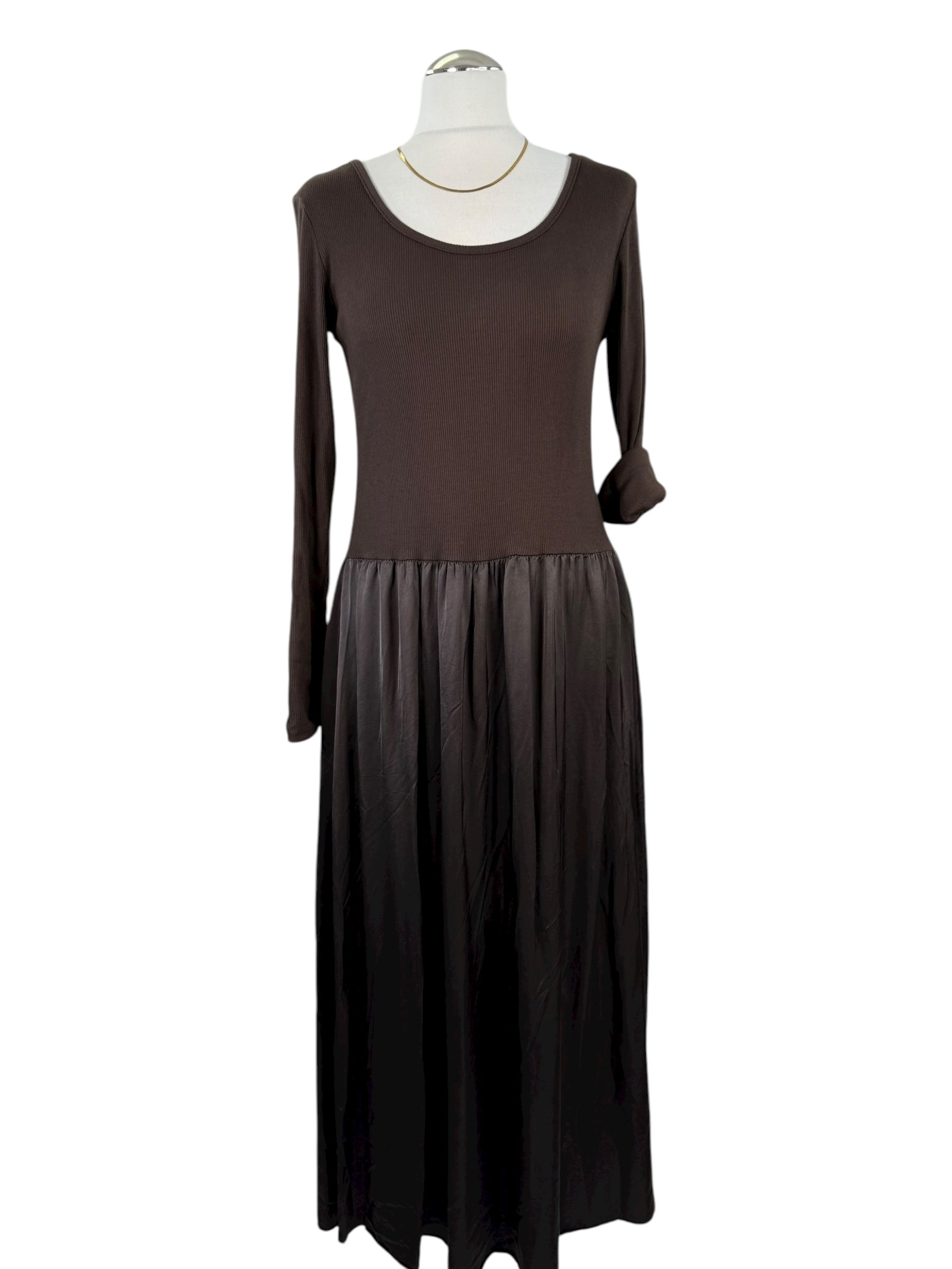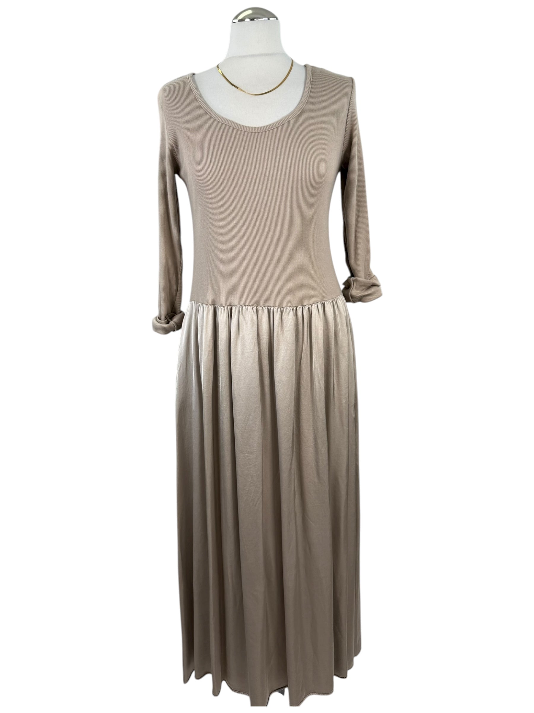 Dieses elegante Seide Kleid mit strukturiertem Oberteil und glänzendem Satinrock ist ein Must-Have für jede modebewusste Frau. Die seitlichen Taschen sind praktisch und der Maxi Schnitt (ca. 132/137 cm) passt für Einheitsgrößen 34-42. Der weiche Stoff aus Seide & Viskose unten und Baumwolle mit Struktur oben verleiht dem Kleid einen Hauch von italienischer Eleganz. Perfekt für jeden Anlass!