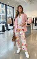 Diese florale High-Waist-Hose überzeugt mit ihrer bequemen Passform und femininen Ausstrahlung. Der hohe Bund formt die Silhouette, während das leichte Design optimalen Tragekomfort bietet – perfekt für Alltag, Büro oder Freizeit.