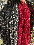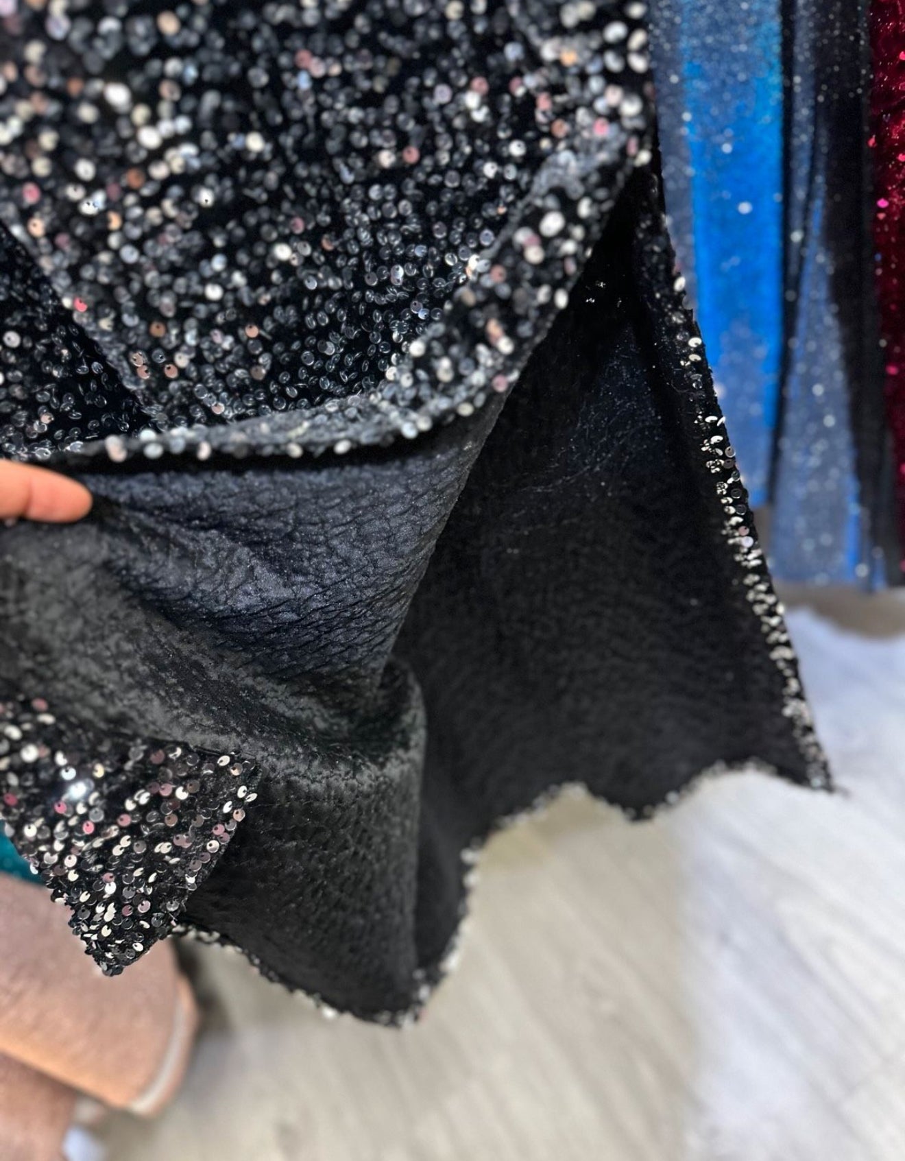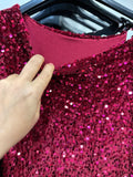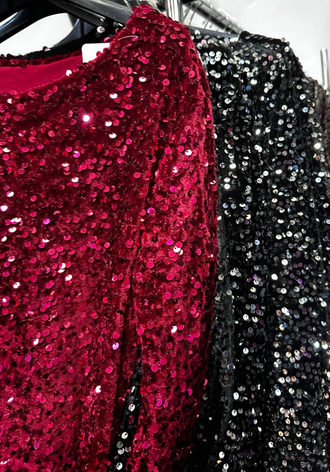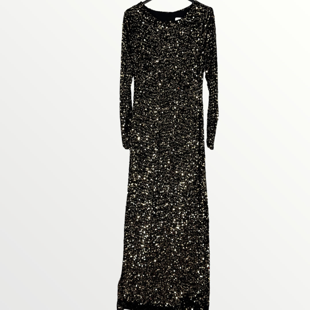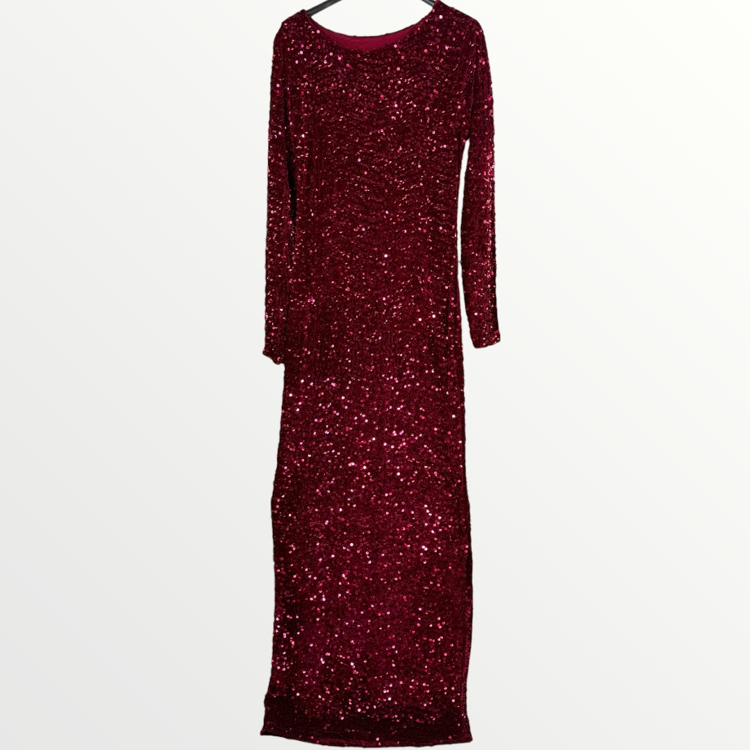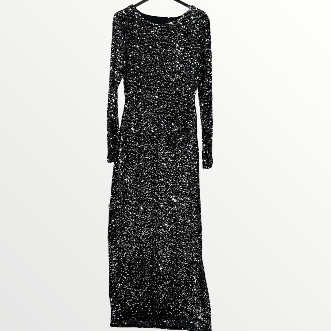 Dieses elegante Pailletten Maxi Kleid mit Schlitz aus Samt ist langärmelig und hat einen figurbetonten Schnitt. Der elastische Stoff sorgt für eine bequeme Passform. Der Rundhalsausschnitt verleiht dem Kleid eine klassische Note. Perfekt für festliche Anlässe und ein echter Hingucker mit seinem funkelnden Paillettendetail.