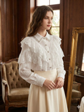 Feine Spitzendetails, verspielte Volants und edle Perlen am Kragen verleihen der Bluse einen luxuriösen und zeitlosen Look.