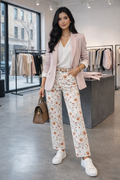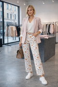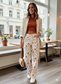 Diese florale High-Waist-Hose überzeugt mit ihrer bequemen Passform und femininen Ausstrahlung. Der hohe Bund formt die Silhouette, während das leichte Design optimalen Tragekomfort bietet – perfekt für Alltag, Büro oder Freizeit.