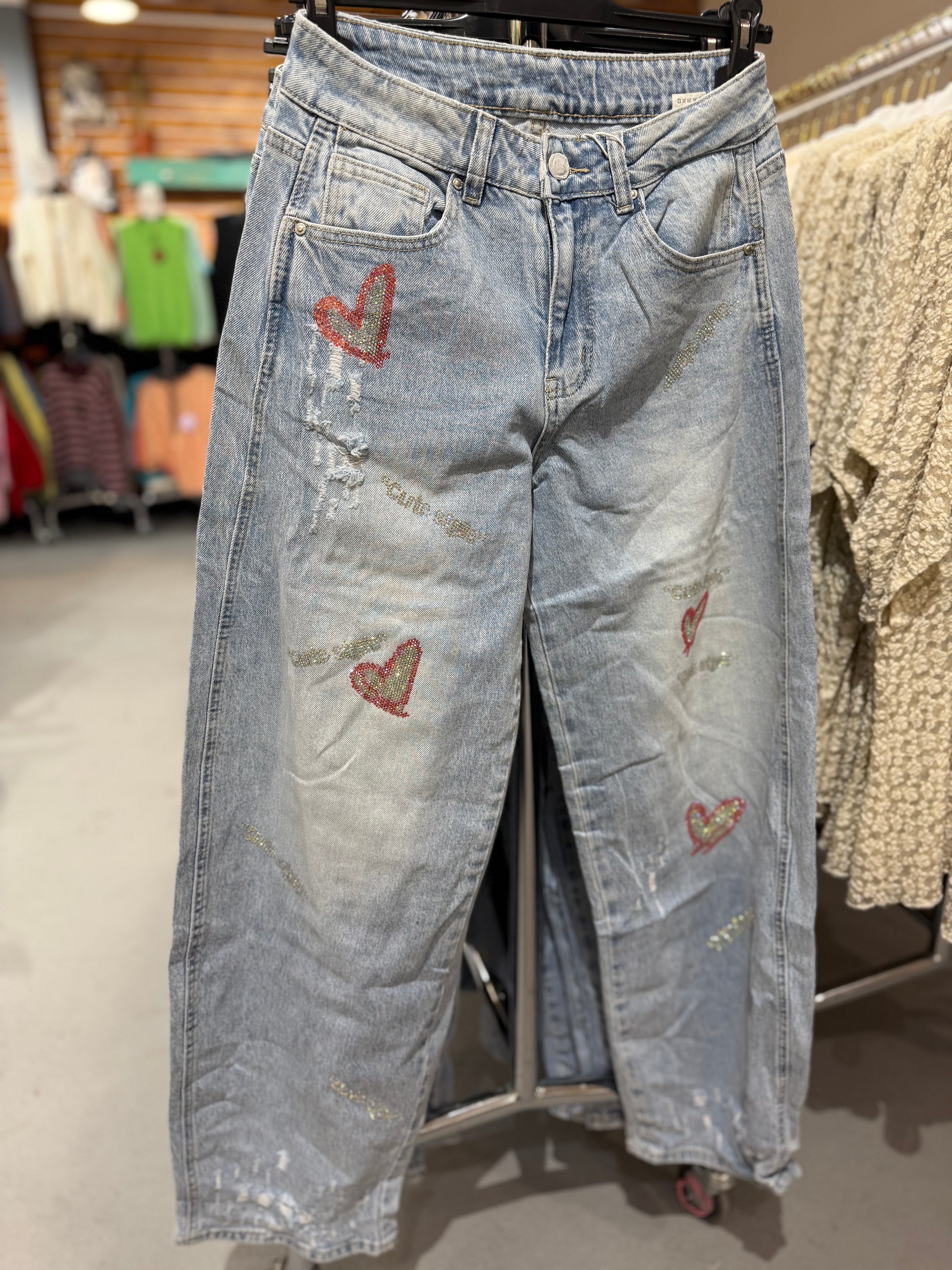 Diese modische Jeans kombiniert Eleganz und Stil mit einem einzigartigen Herz-Patchwork und funkelnden Stickereien. Ob casual oder chic – sie ist die perfekte Wahl für jede Gelegenheit.
