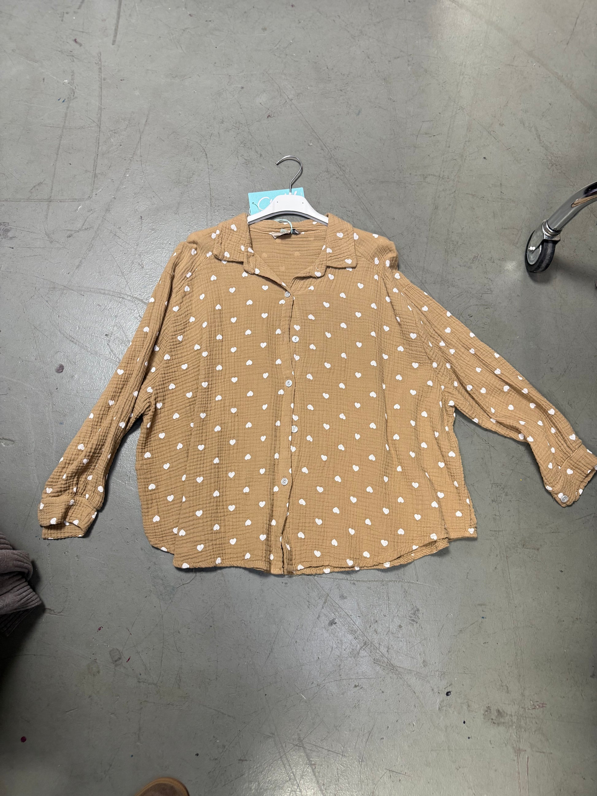 Herz print Musselin Hemd Bluse Kurz , dunkel beige 01