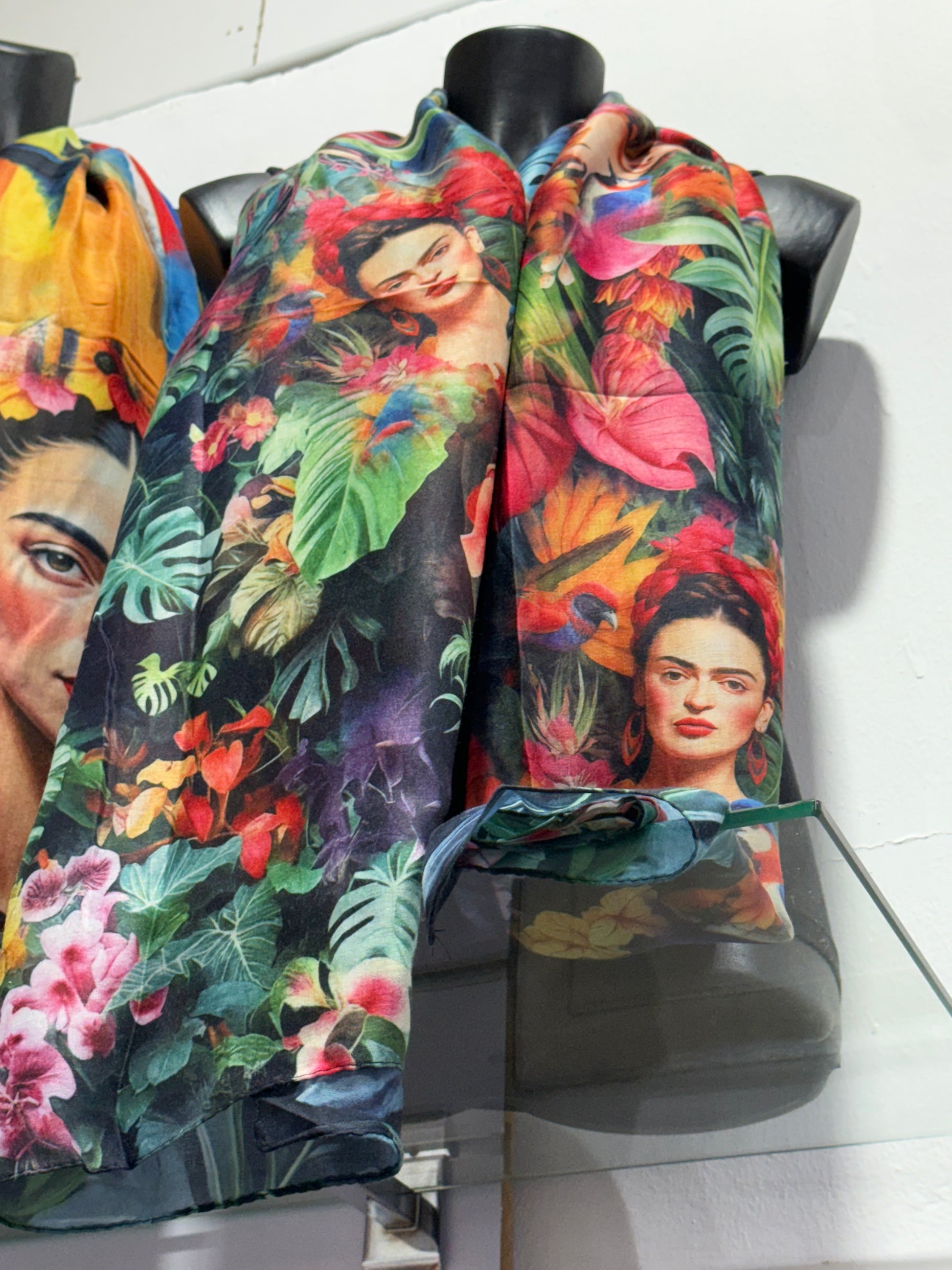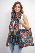 Dieser elegante Damen-Schal und Tasche begeistert mit seinem außergewöhnlichen Design im künstlerischen Stil. Das ausdrucksstarke Porträtmotiv in Kombination mit tropischen Blumen verleiht jedem Outfit eine besondere, stilvolle Note.