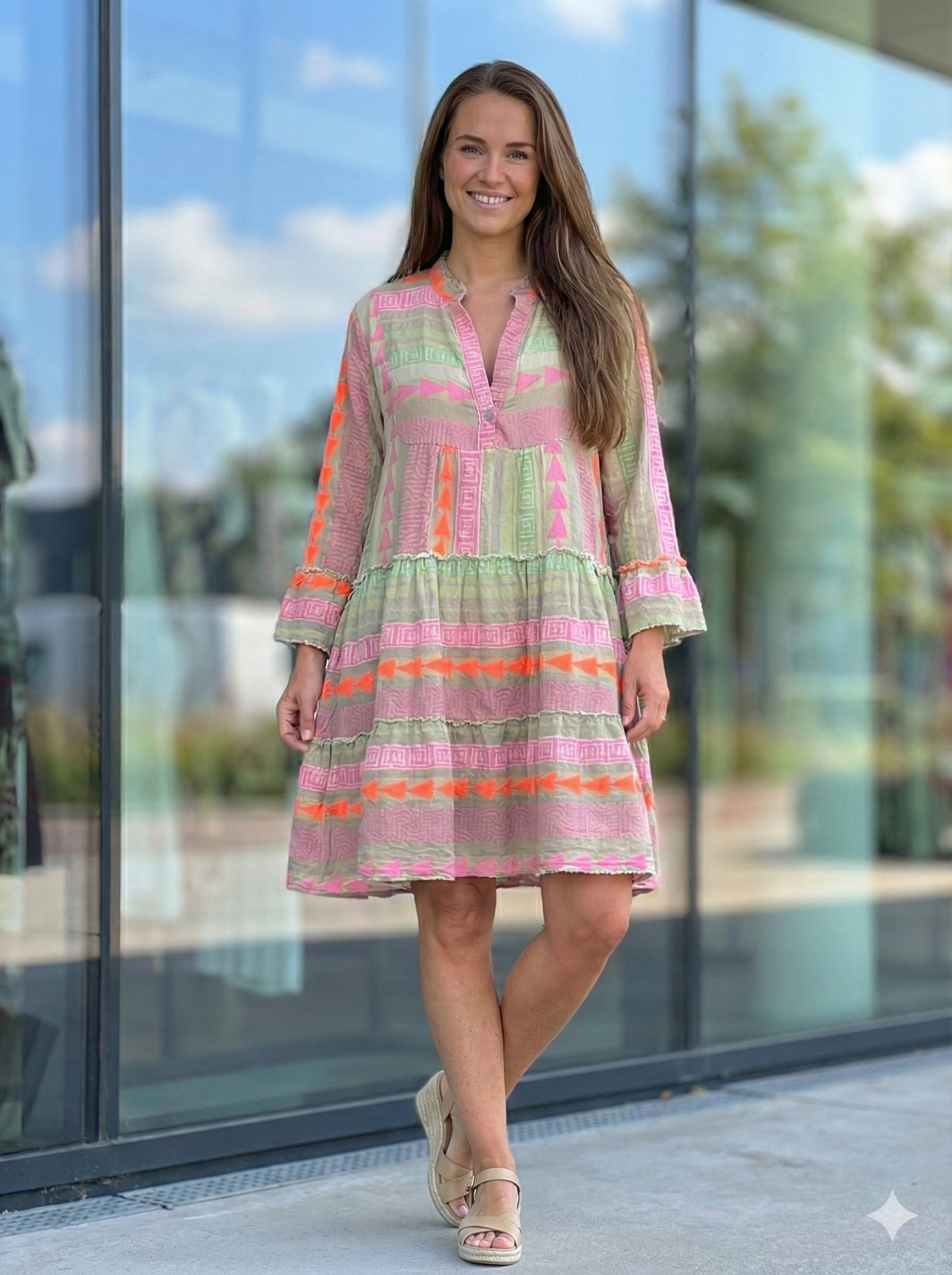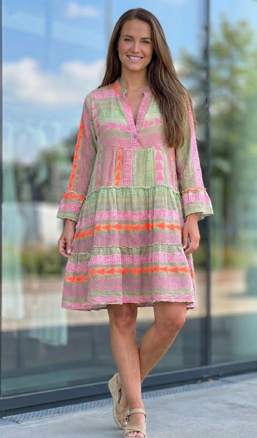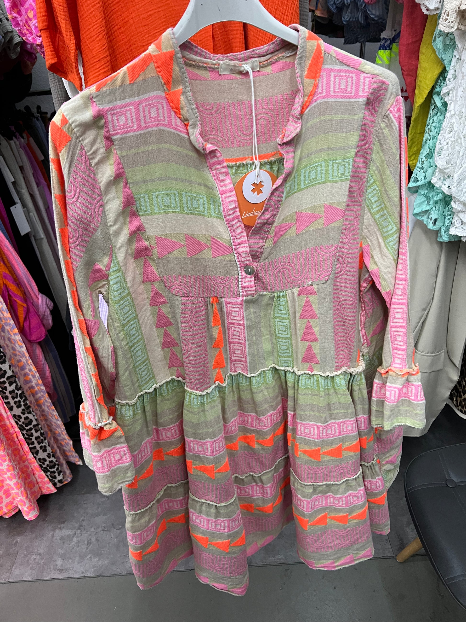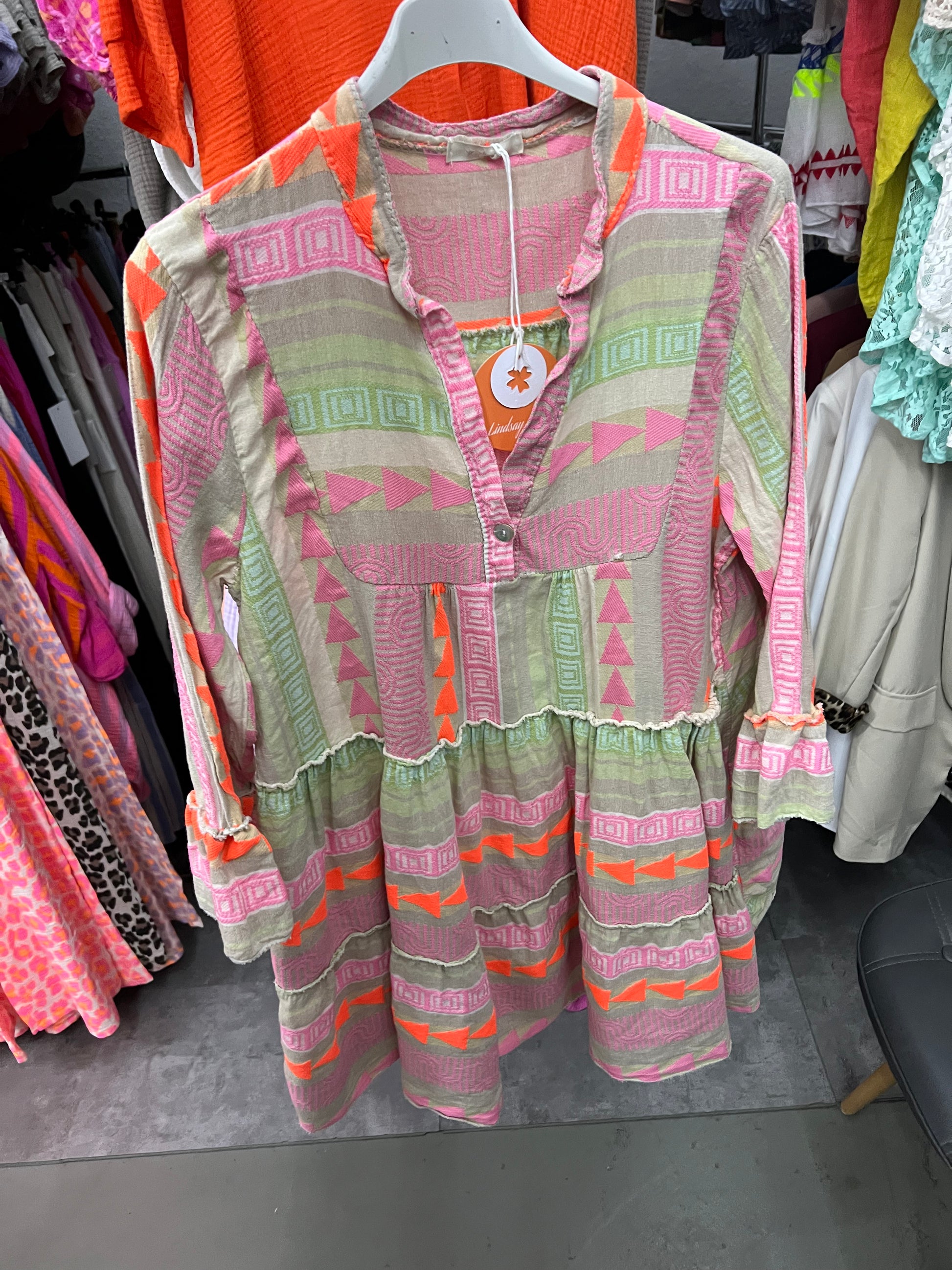 Neu Damen Kleid Tunika Ibiza in leuchtendem Orange. Der gewebte, blickdichte Stoff bietet höchste Qualität und Komfort. Mit Volants an den Ärmeln und einem V-Ausschnitt mit Knopf. Passt den Größen 36 bis 42, Maße: 54 cm Achsel zu Achsel, 94 cm Länge. Perfekt für den Sommer mit den Größen XS bis XL.