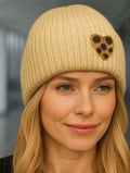 Leopard Herz Stick Mütze mit Umschlag Creme