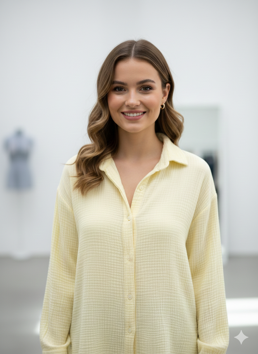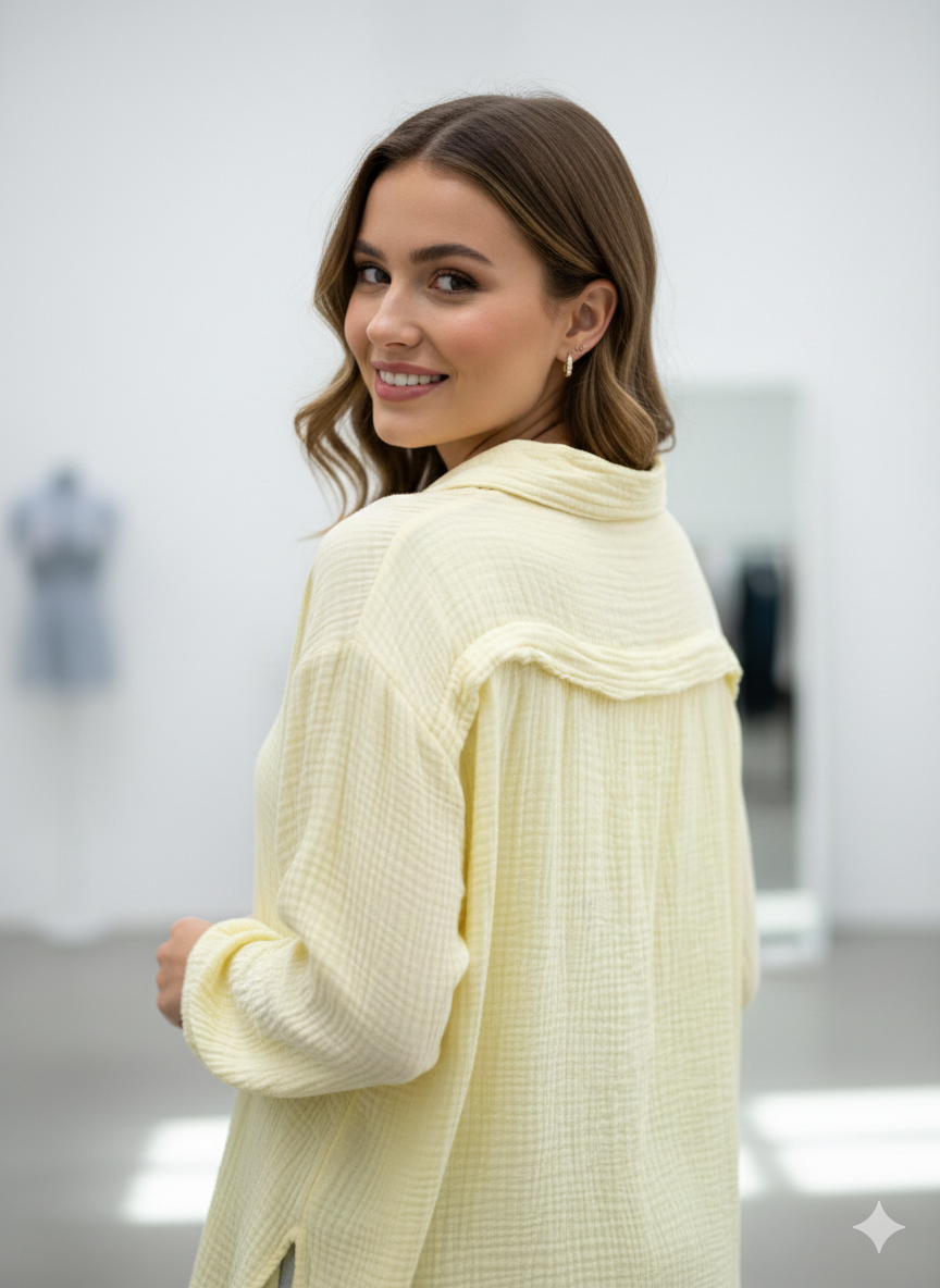 Entdecken Sie unser neues Damen Musselin Hemd Bluse, gefertigt aus 100% gecrinkeltem Baumwollstoff für höchsten Komfort und Stil. Mit seiner Einheitsgröße und einer Auswahl an vier saisonalen Farben ist dieses Hemd vielseitig einsetzbar und passt sich jeder Gelegenheit an.
