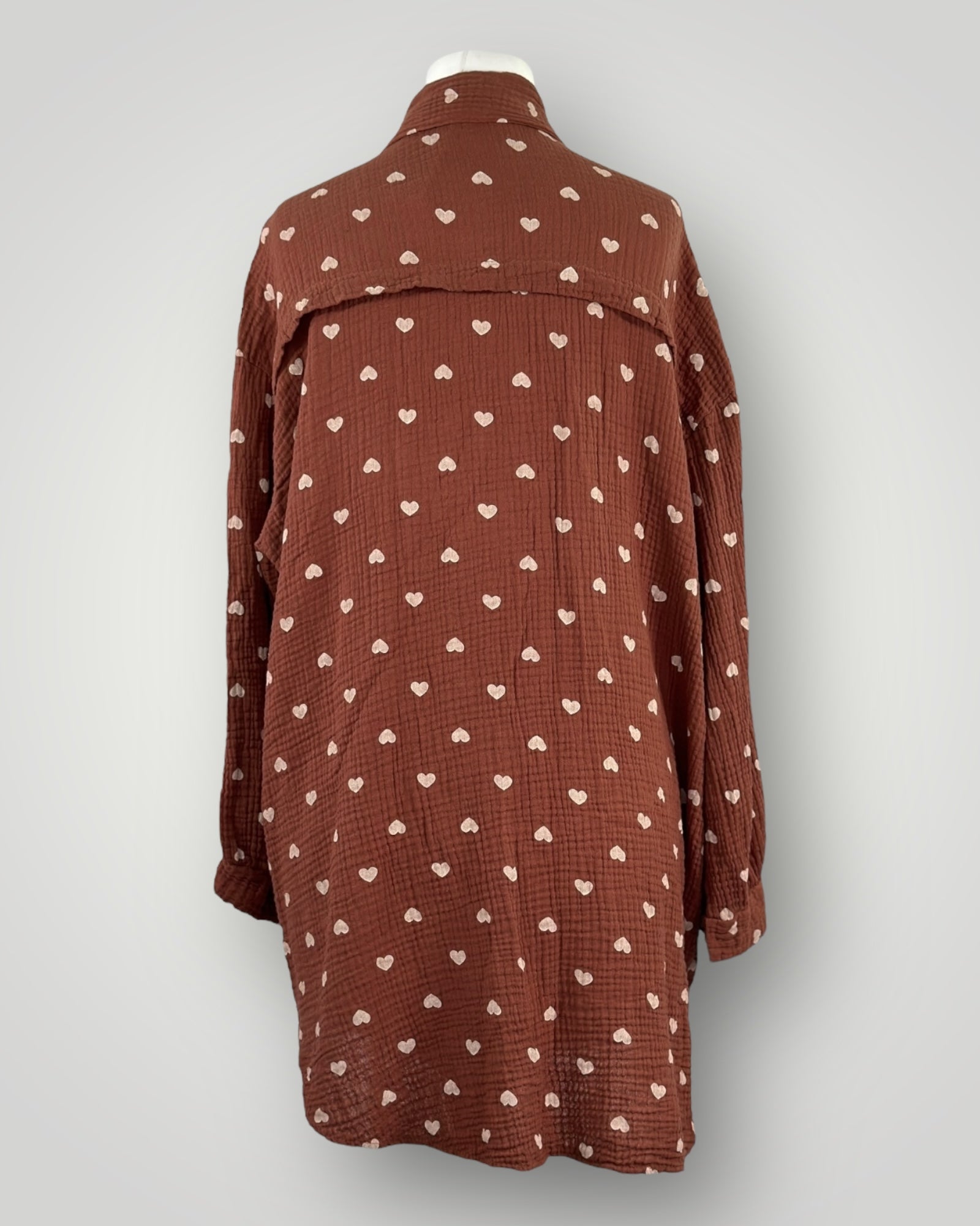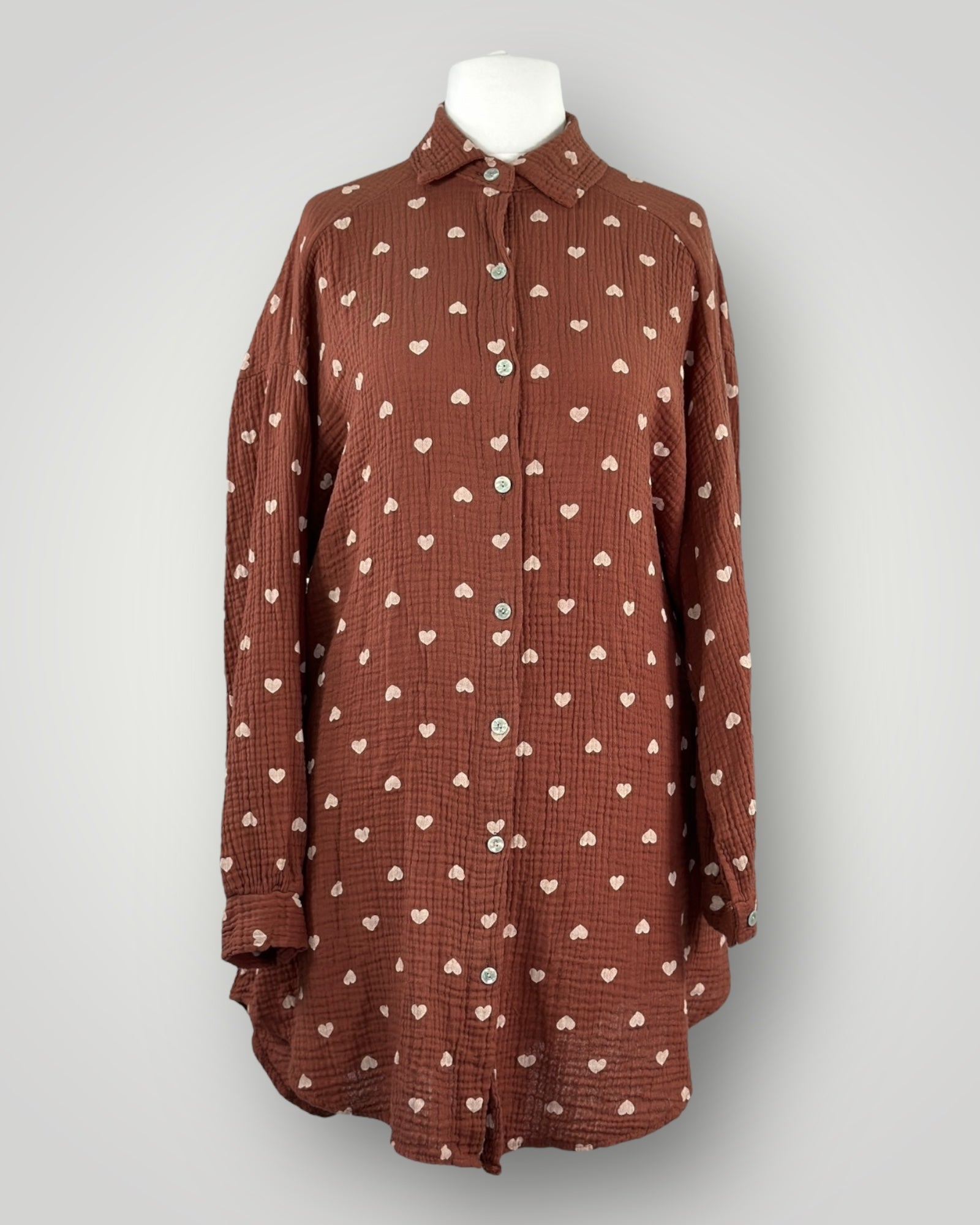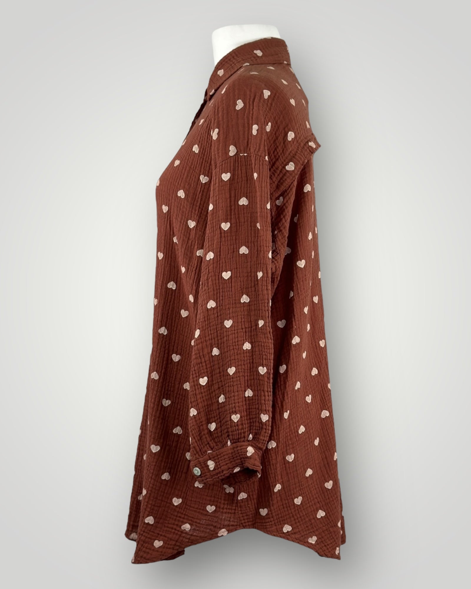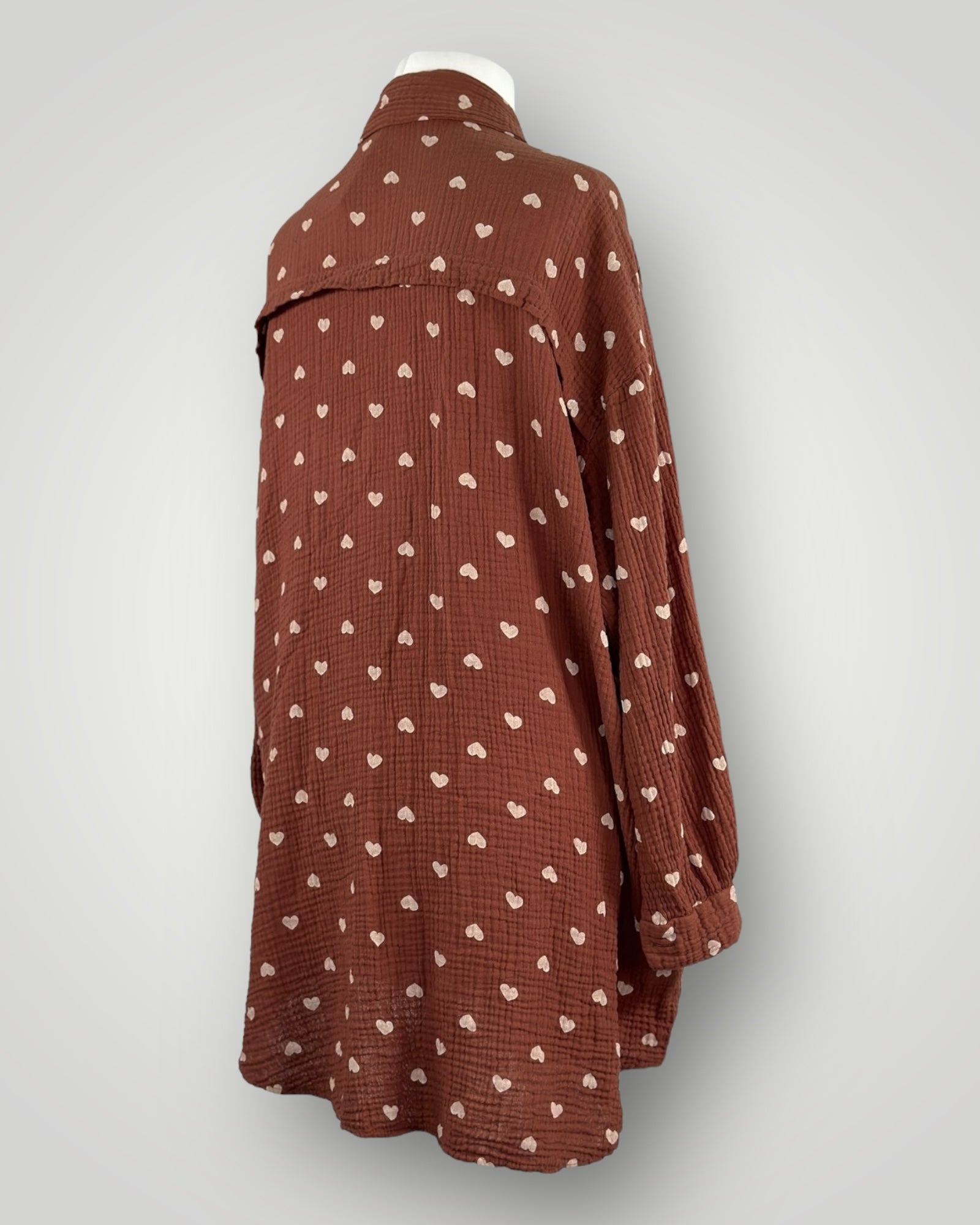 Diese LARA Hemdbluse ist aus 100% weicher Baumwolle mit einem liebevollen Herzenprint auf dem Musselin gefertigt. Genießen Sie den Tragekomfort und die hochwertige Qualität dieser Bluse. Perfekt für alle, die einen verspielten Look lieben und trotzdem nicht auf stilvolle Eleganz verzichten möchten.