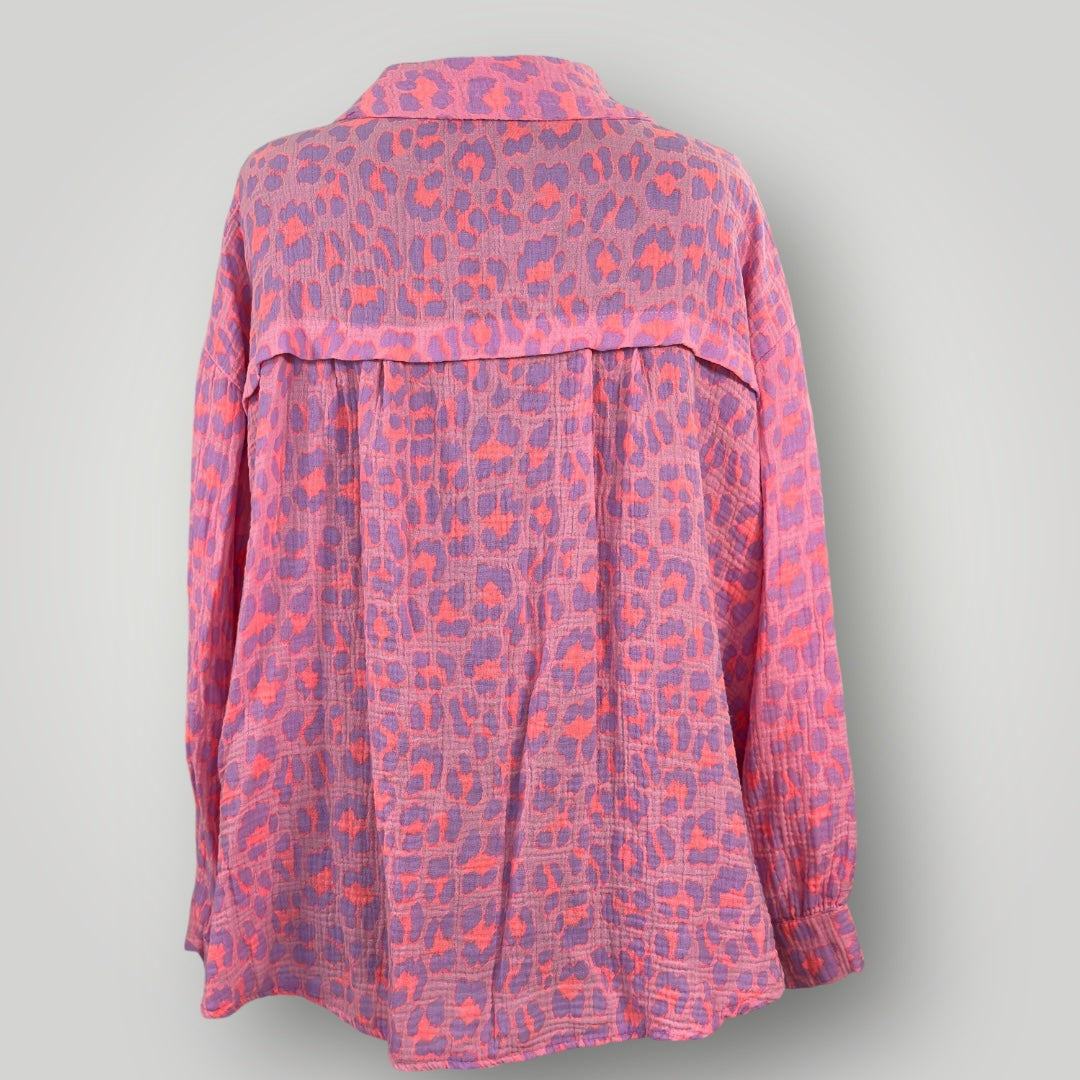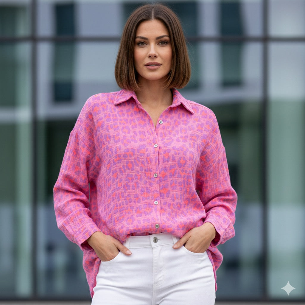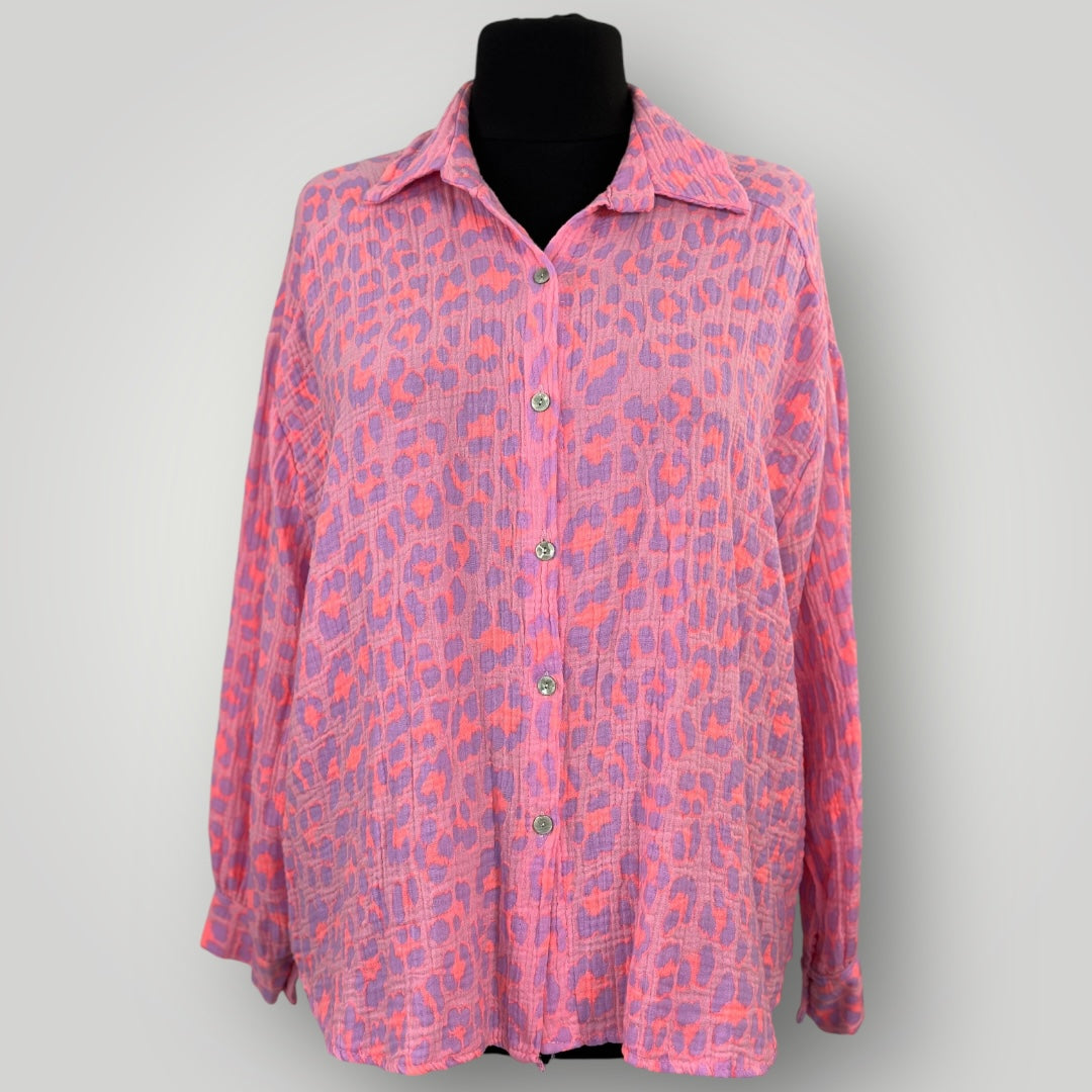 Musselin Leopard Hemd Bluse Neon Pink Orange Lila Kurz