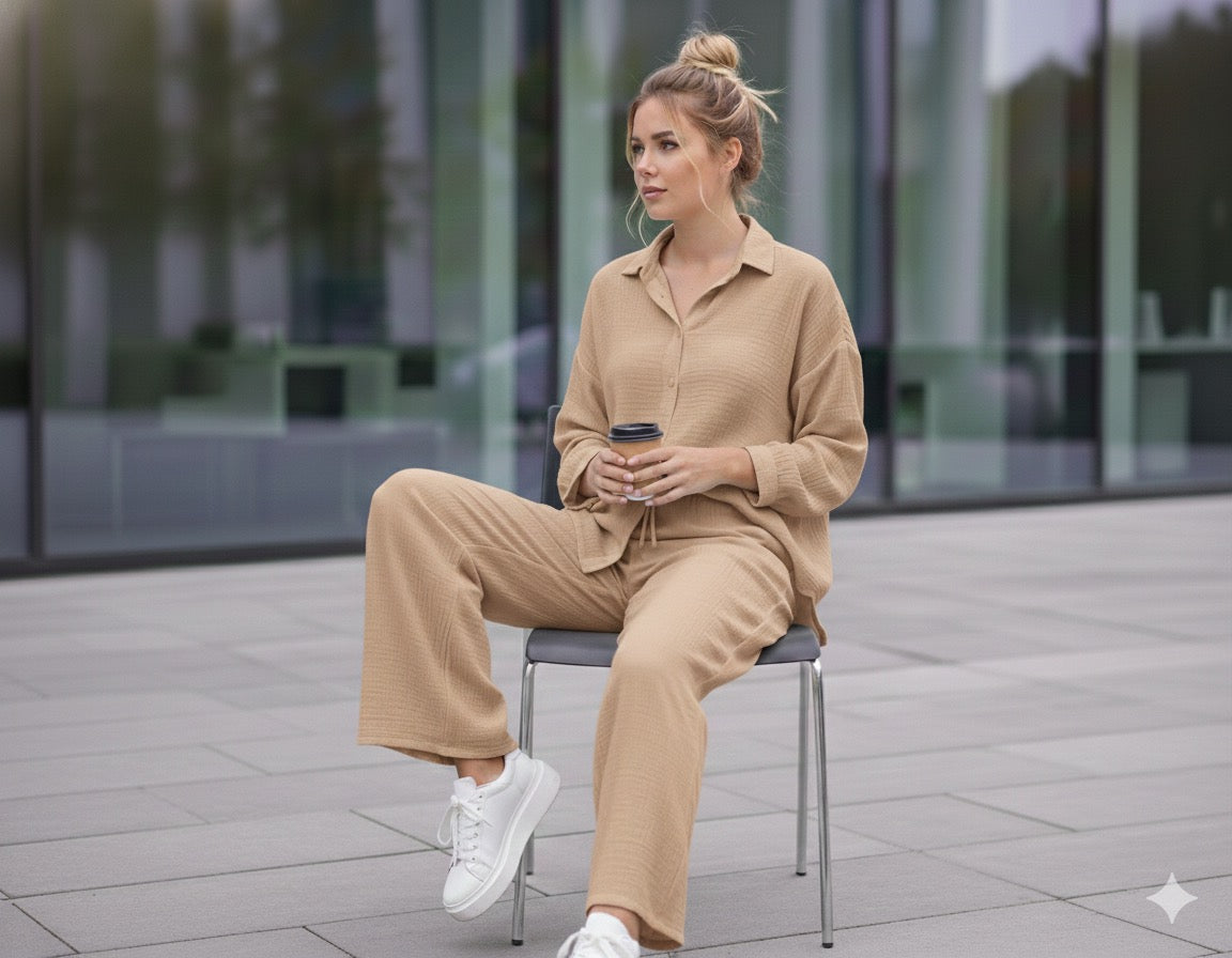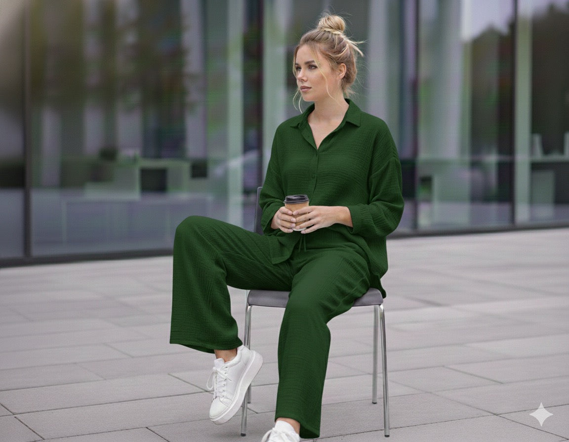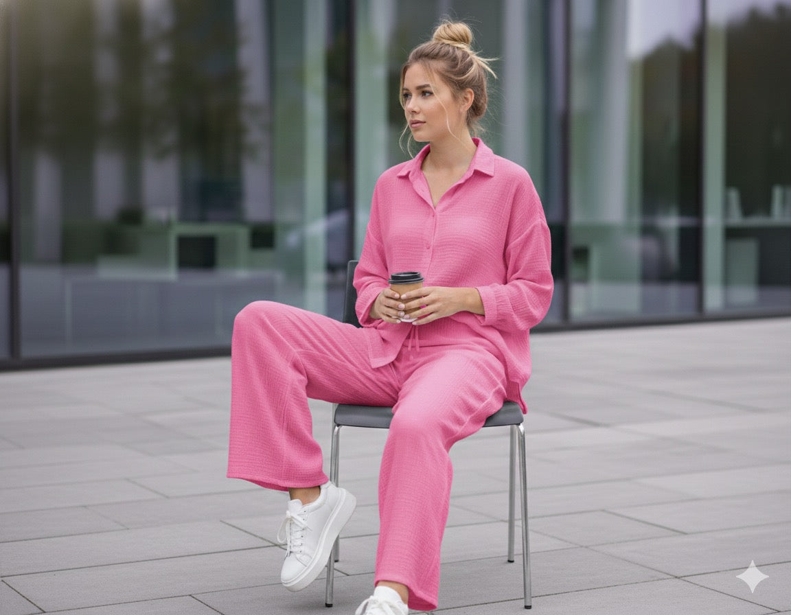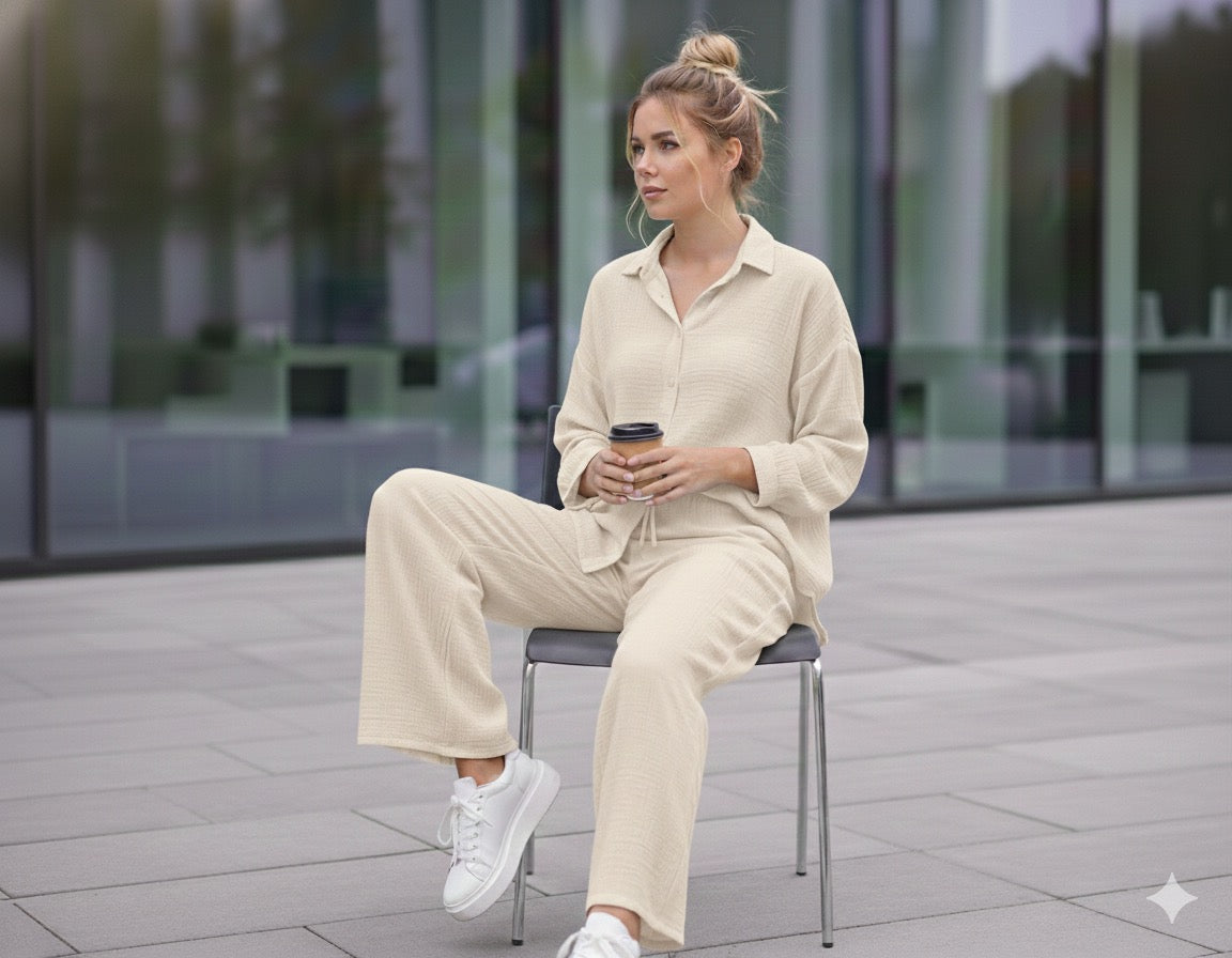 Dieses Neu Damen %100 Musselin Zweiteiler Set beinhaltet ein bequemes Hemd und eine Hose, die perfekt aufeinander abgestimmt sind. Der gecrinkelte Musselin Baumwollstoff sorgt für ein angenehmes Tragegefühl und die Knöpfe am Halsausschnitt verleihen dem Set einen klassischen Touch. Mit der Einheitsgröße passt es zu jeder Figur und ist für jede Jahreszeit geeignet. Perfekt für den Alltag, Strand oder Partys, kombiniert mit Sandalen oder Sneakers für einen sommerlichen Boho-Look.
