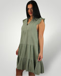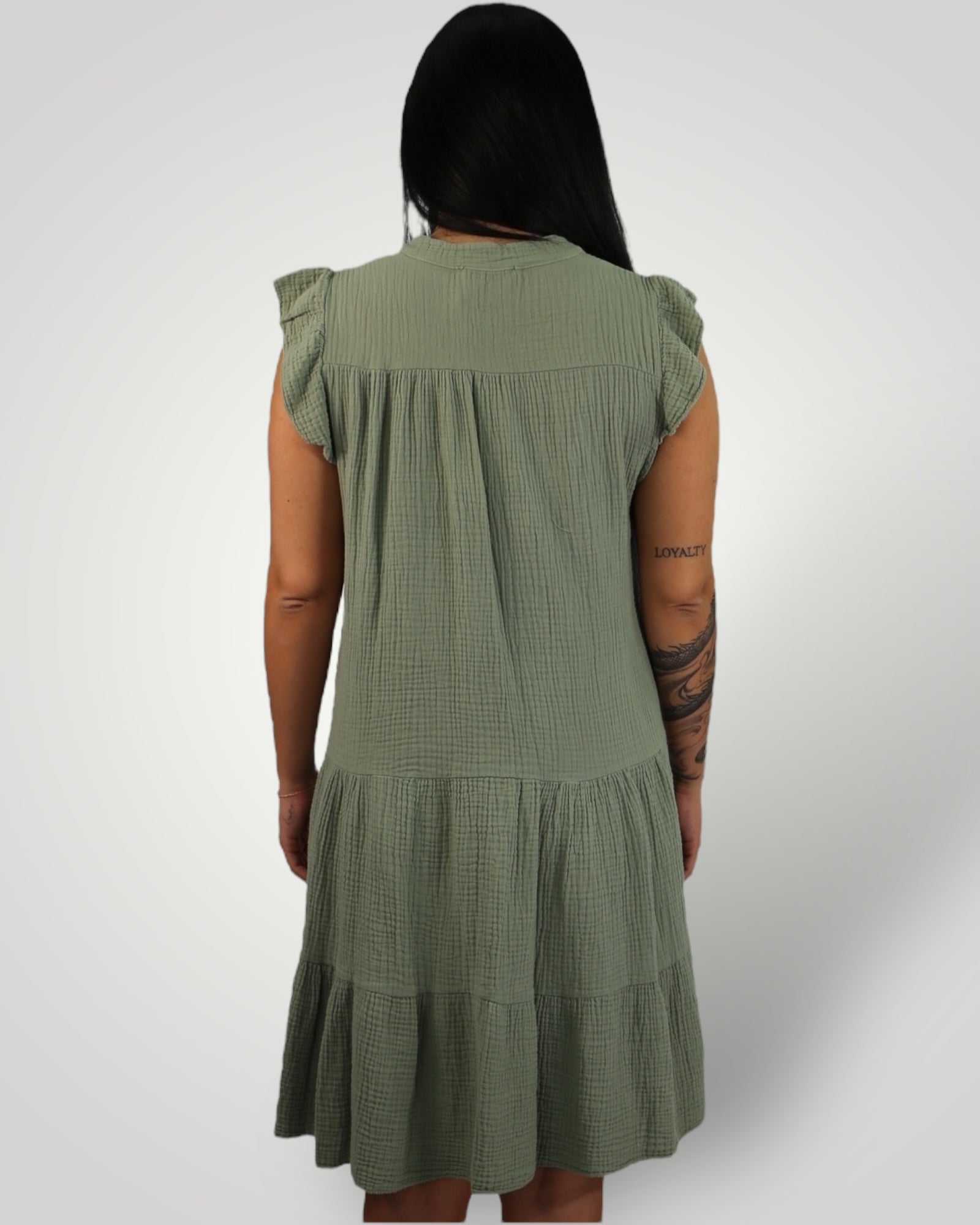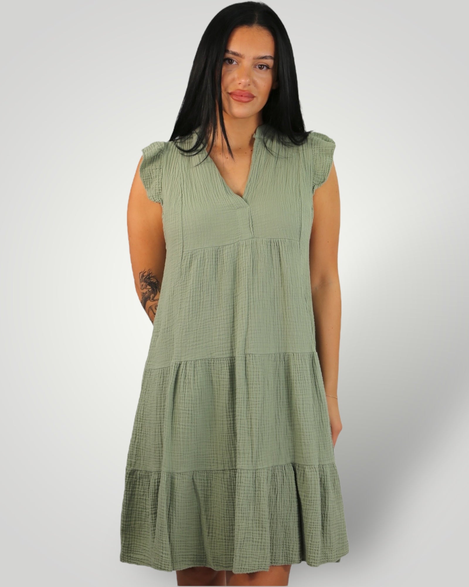 Entdecken Sie unser trendiges Musselinkleid mit Volantärmeln! Hergestellt aus 100% Baumwolle bietet es höchsten Tragekomfort und ein modisches Design. Perfekt für den Sommer, verleiht es Ihnen einen lässigen und dennoch eleganten Look. Holen Sie sich jetzt unser Must-have Kleid mit V-Halsausschnitt!