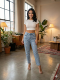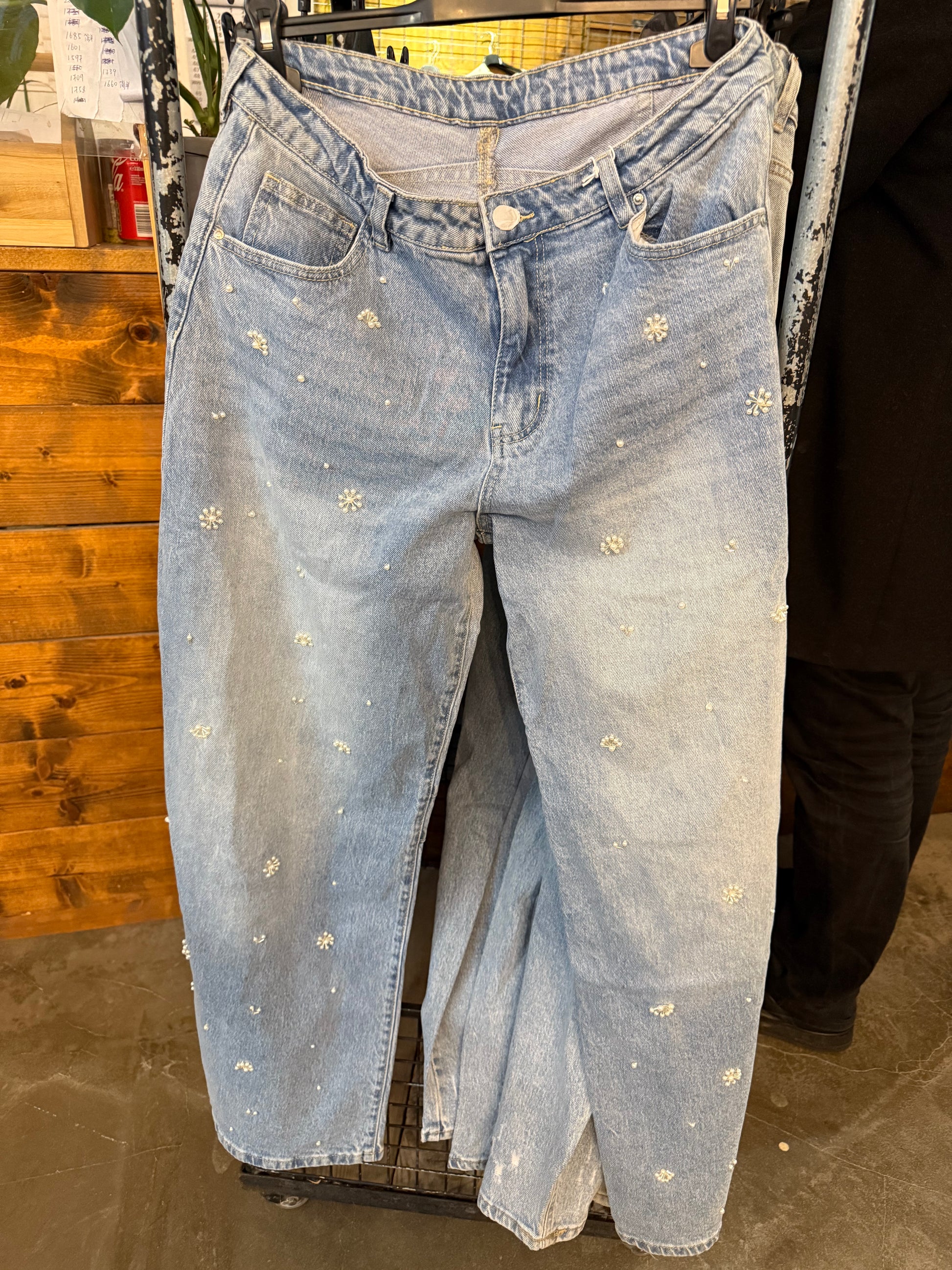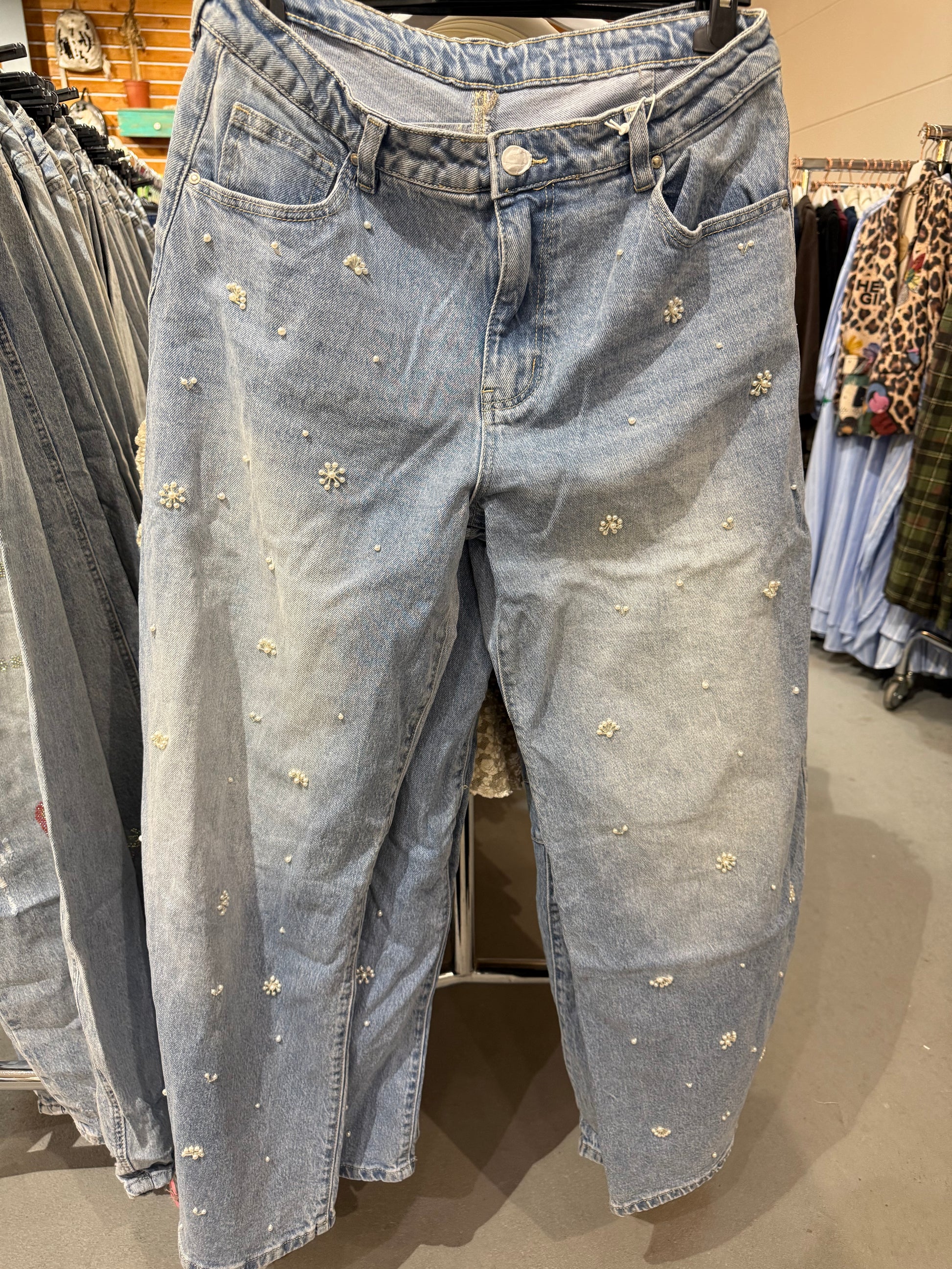 Diese modische Jeans kombiniert Eleganz und Stil mit einem einzigartigen perle - und funkelnden Stickereien. Ob casual oder chic – sie ist die perfekte Wahl für jede Gelegenheit.