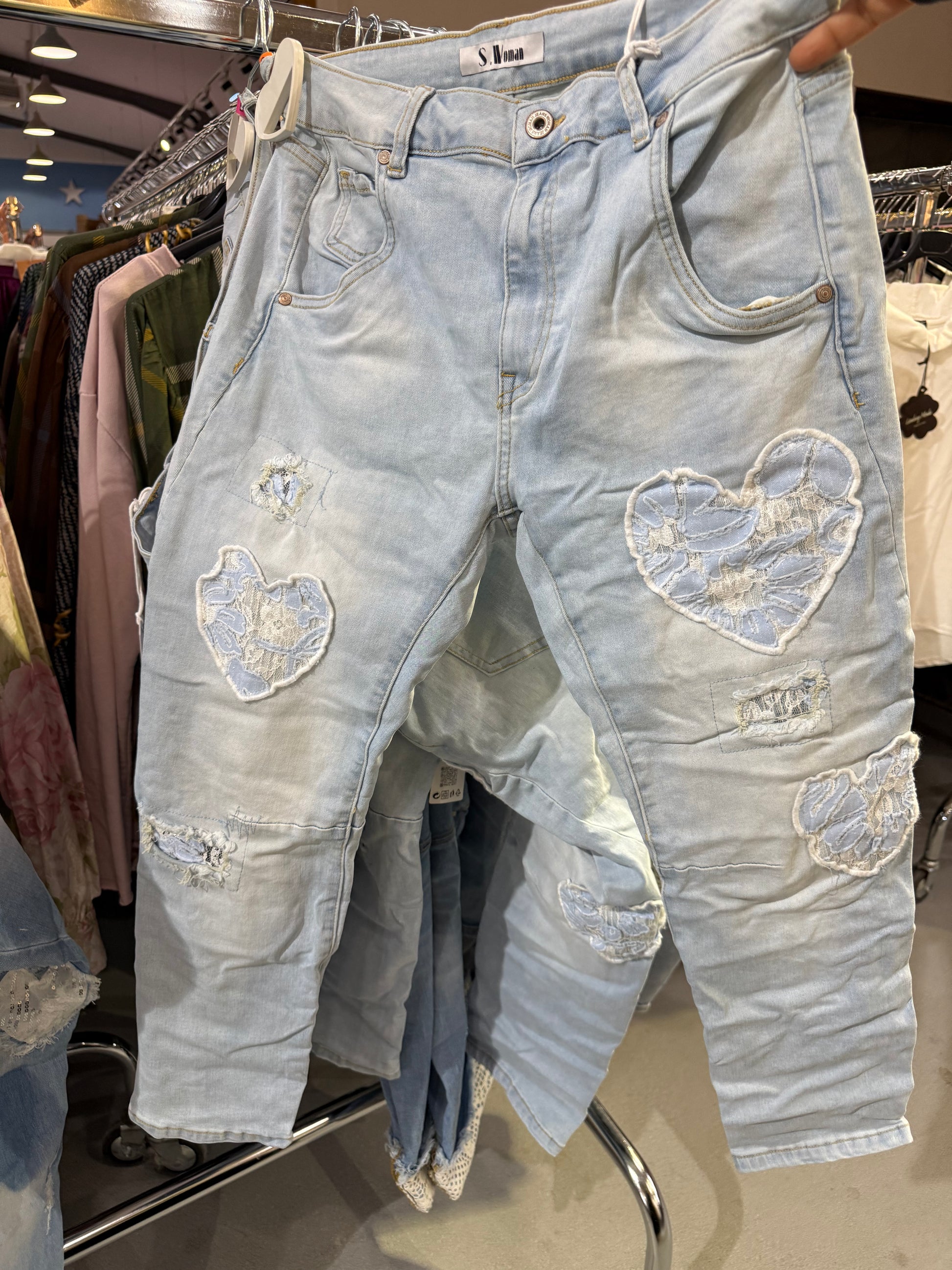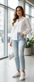 Diese modische Jeans kombiniert Eleganz und Stil mit einem einzigartigen Herz-Patchwork und funkelnden Stickereien. Ob casual oder chic – sie ist die perfekte Wahl für jede Gelegenheit.