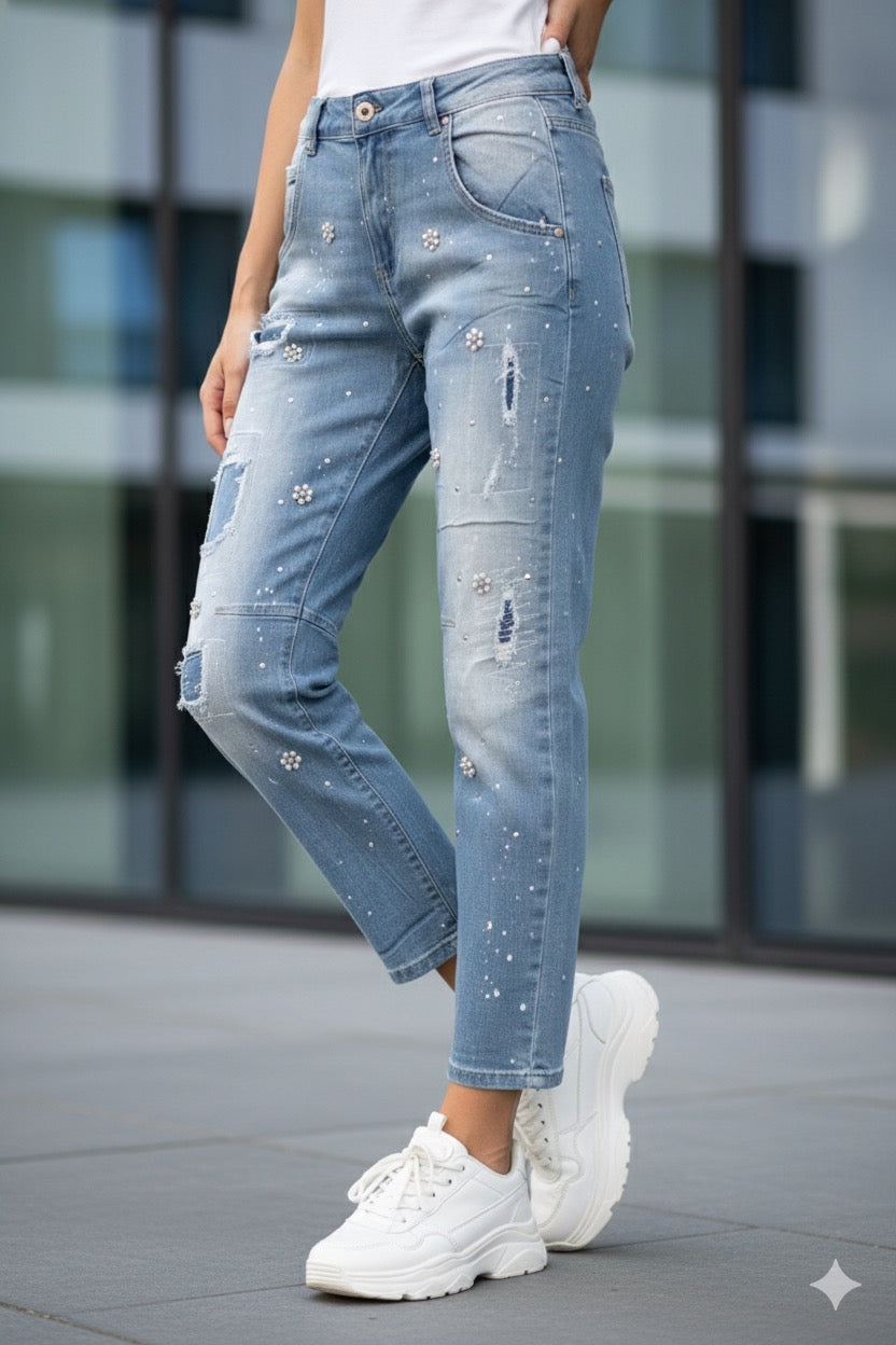 Diese modische Jeans kombiniert Eleganz und Stil mit einem einzigartigen Herz-Patchwork und funkelnden Stickereien. Ob casual oder chic – sie ist die perfekte Wahl für jede Gelegenheit.