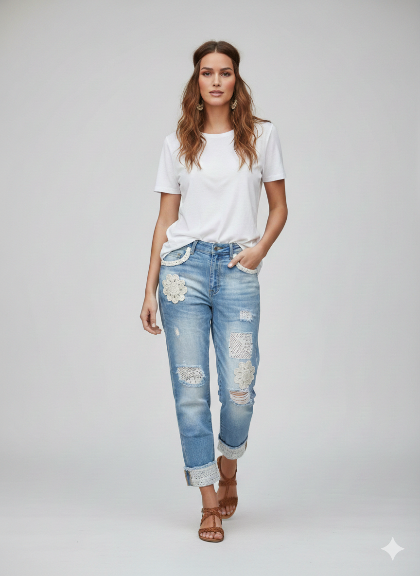 Diese modische Jeans kombiniert Eleganz und Stil mit einem einzigartigen Herz-Patchwork und funkelnden Stickereien. Ob casual oder chic – sie ist die perfekte Wahl für jede Gelegenheit.