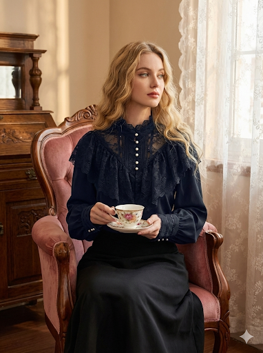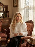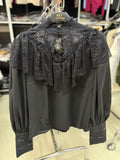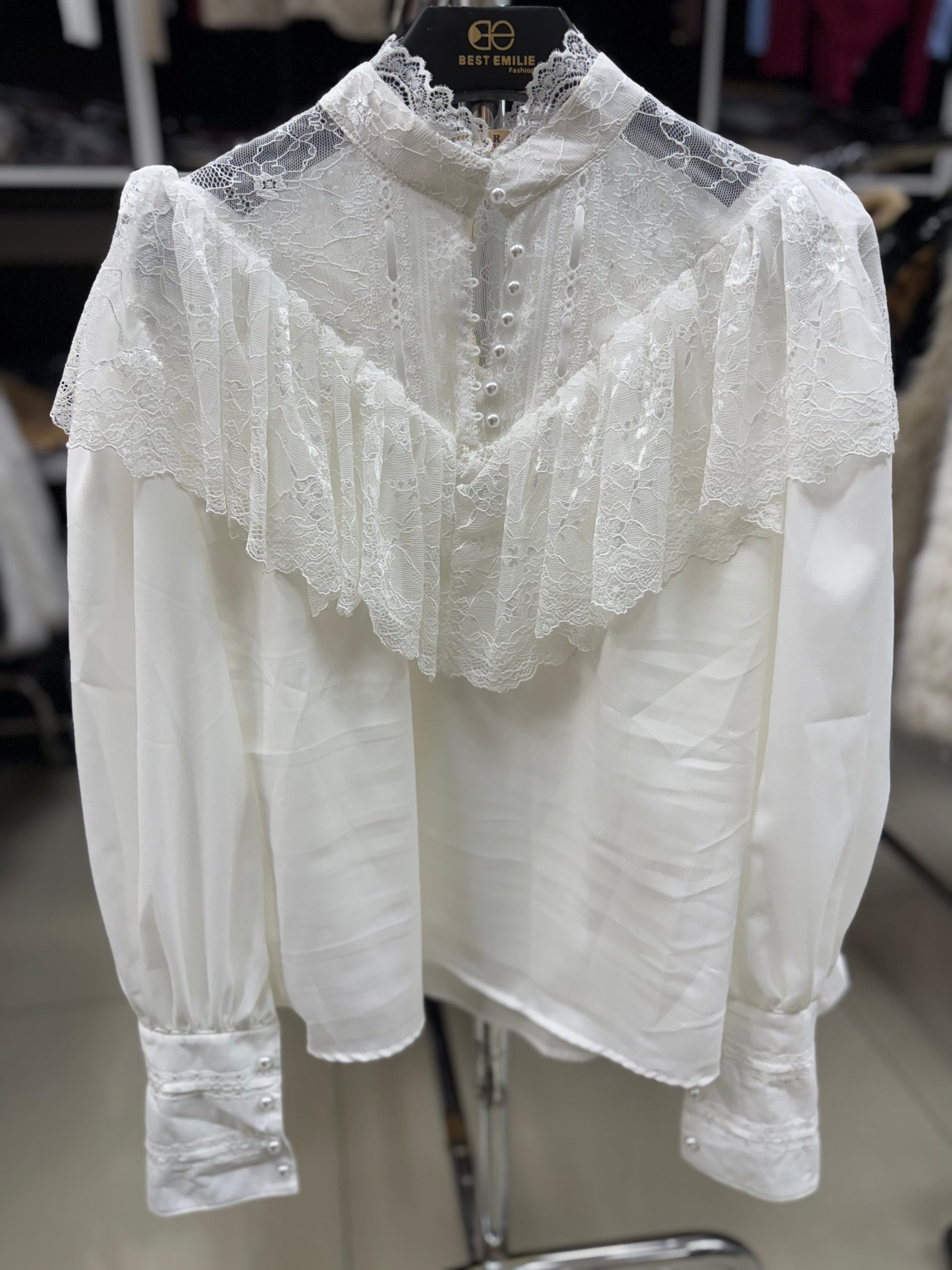 Feine Spitzendetails, verspielte Volants und edle Perlen- & Strasssteine am Kragen verleihen der Bluse einen luxuriösen und zeitlosen Look.