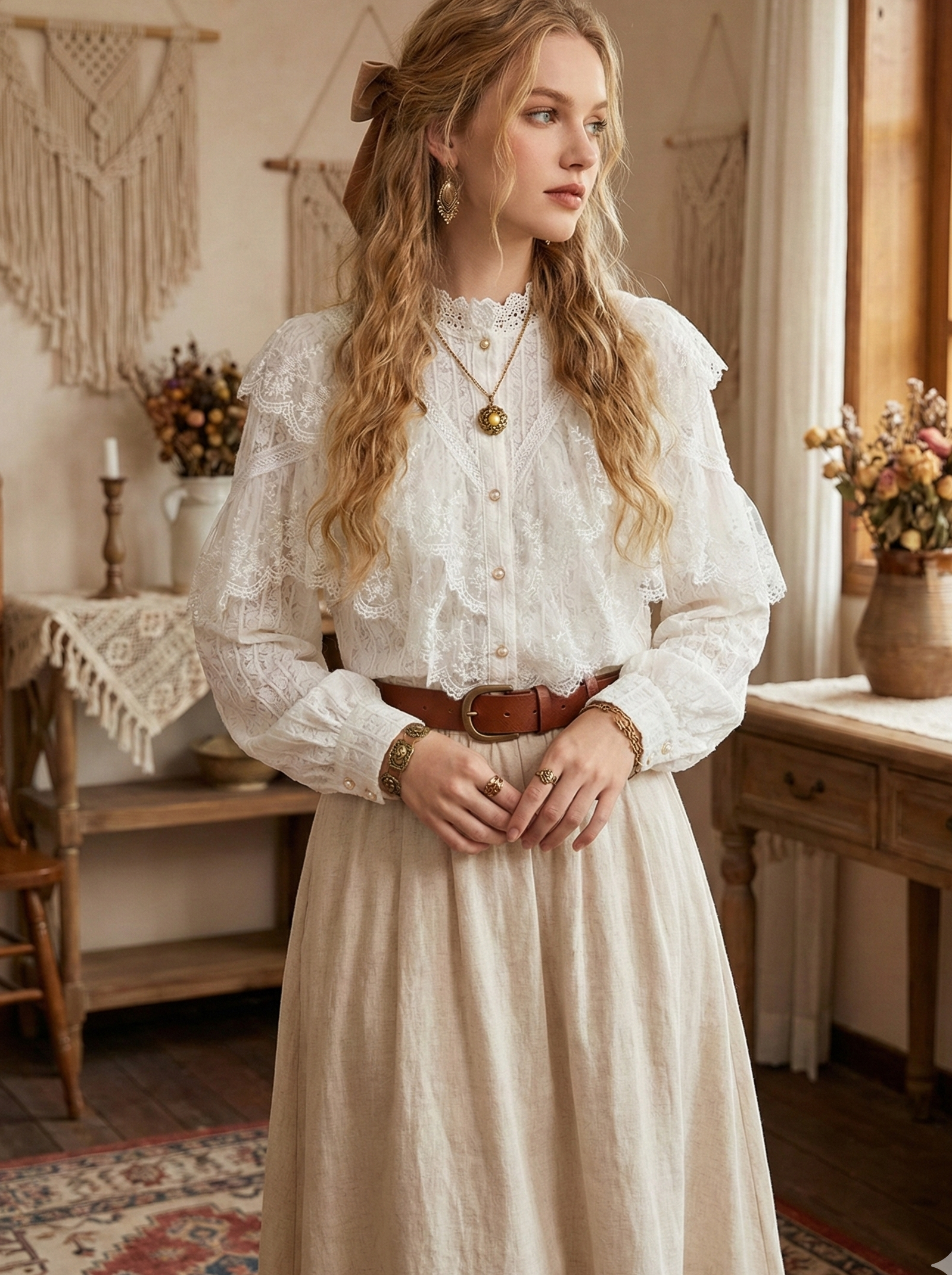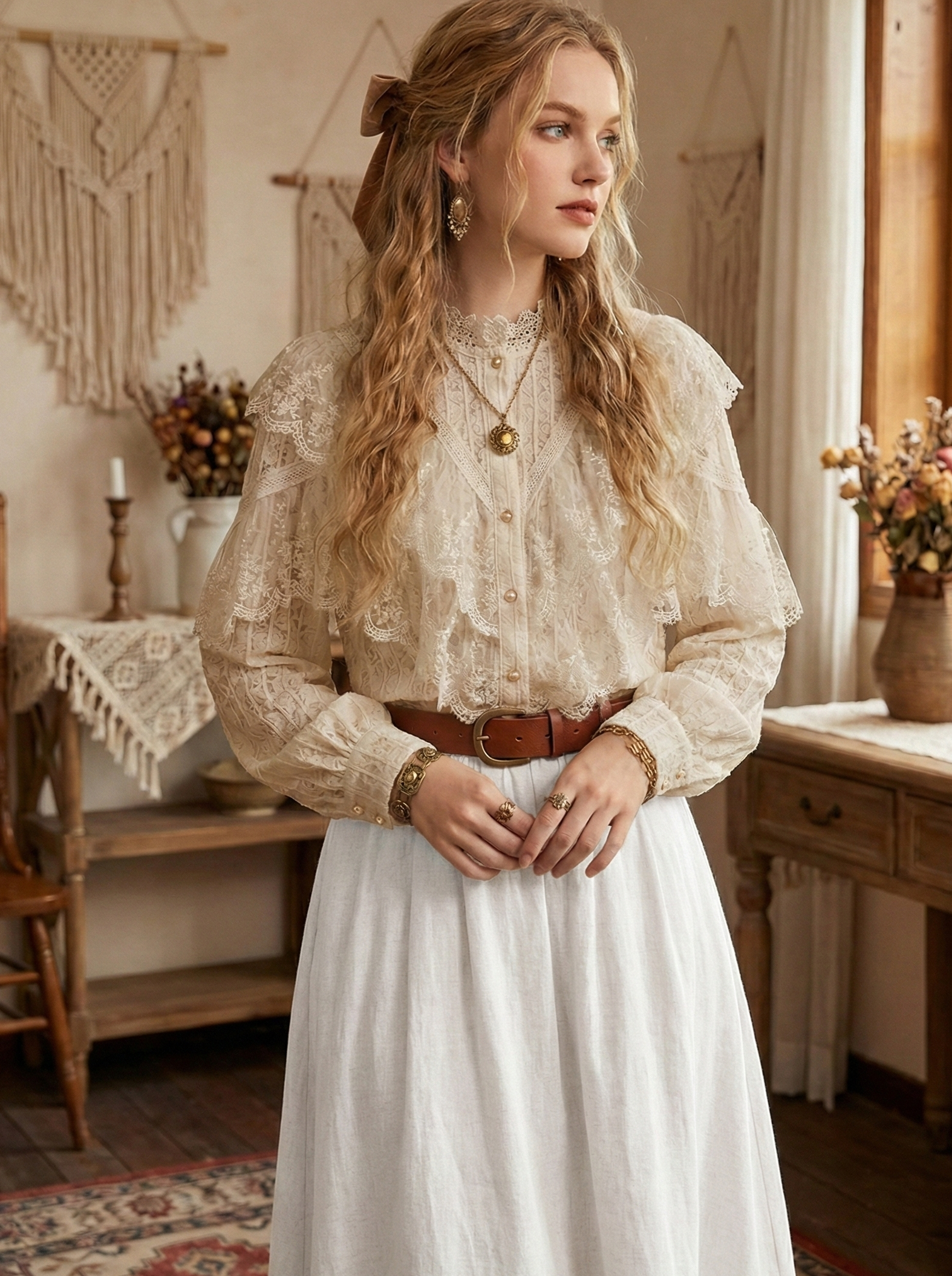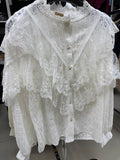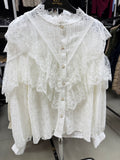 Feine Spitzendetails, verspielte Volants und edle Perlen- & Strasssteine am Kragen verleihen der Bluse einen luxuriösen und zeitlosen Look.