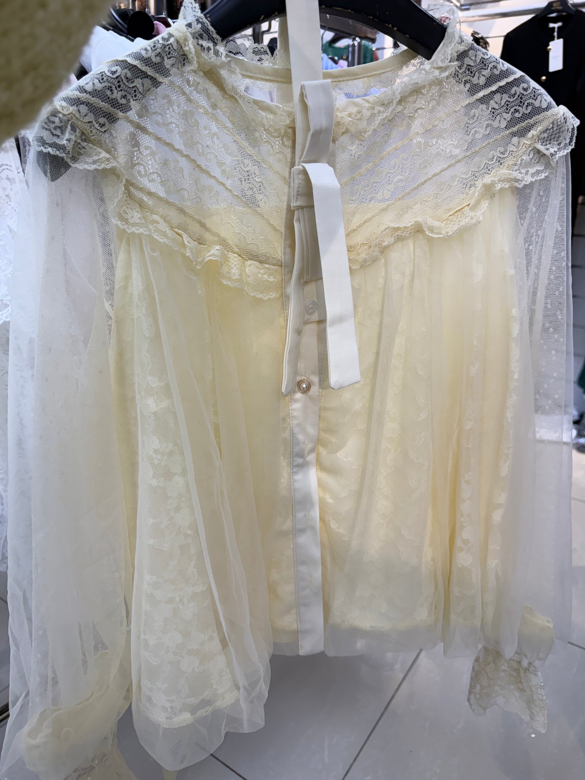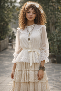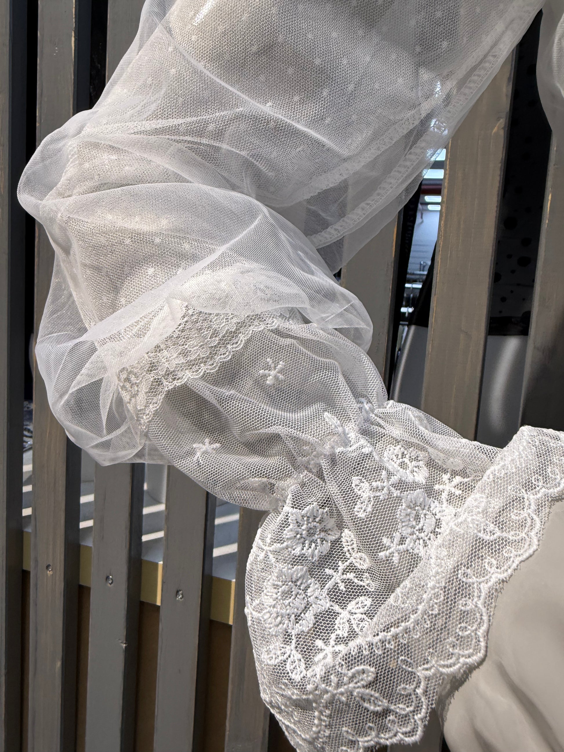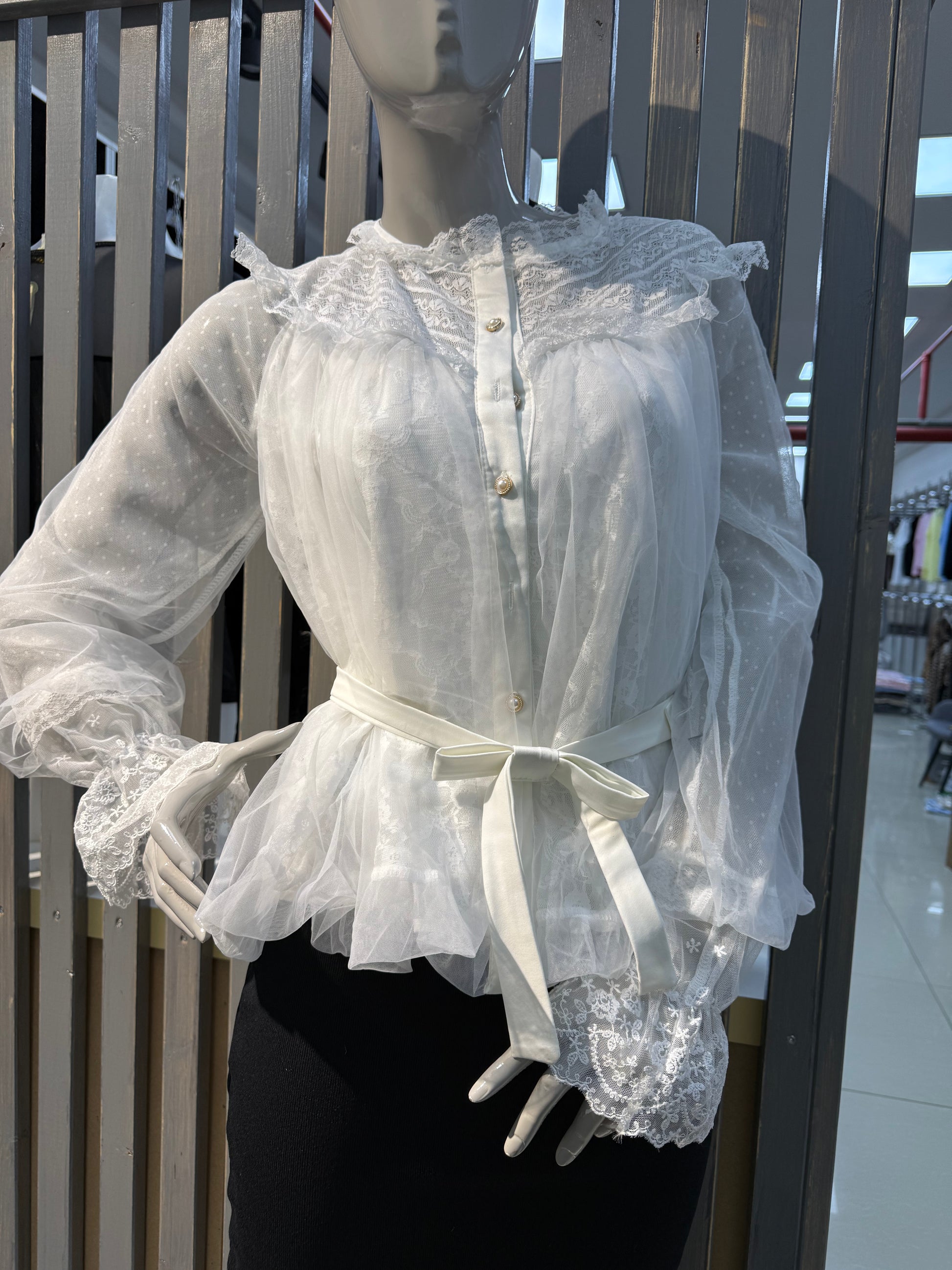 Feine Spitzendetails, verspielte Volants und edle Perlen- & Strasssteine am Kragen verleihen der Bluse einen luxuriösen und zeitlosen Look.